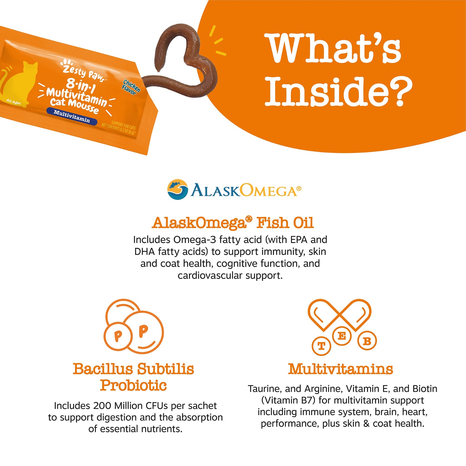 - Eight Benefits in One Tasty Squeeze! - Zesty Paws 8-in-1 Multivitamin Cat Mousse is a supplement that targets eight areas of your pet's health and well-being to keep them feeling their best.