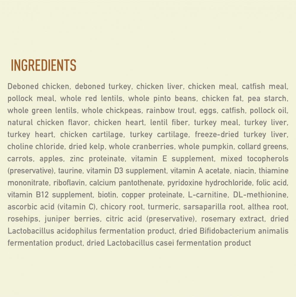 Deboned chicken, deboned turkey, chicken liver, chicken meal, catfish meal, pollock meal, whole red lentils, whole pinto beans, chicken fat, pea starch, whole green lentils, whole chickpeas, rainbow trout, eggs, catfish, pollock oil, natural chicken flavor, chicken heart, lentil fiber, turkey meal, turkey liver, turkey heart, chicken cartilage, turkey cartilage, freeze-dried turkey liver, choline chloride, dried kelp, whole cranberries, whole pumpkin, collard greens, carrots, apples, zinc proteinate, vitamin E supplement, mixed tocopherols (preservative), taurine, vitamin D3 supplement, vitamin A acetate, niacin, thiamine mononitrate, riboflavin, calcium pantothenate, pyridoxine hydrochloride, folic acid, vitamin B12 supplement, biotin, copper proteinate, L-carnitine, DL-methionine, ascorbic acid (vitamin C), chicory root, turmeric, sarsaparilla root, althea root, rosehips, juniper berries, citric acid (preservative), rosemary extract, dried Lactobacillus acidophilus fermentation product, dried Bifidobacterium animalis fermentation product, dried Lactobacillus casei fermentation product.