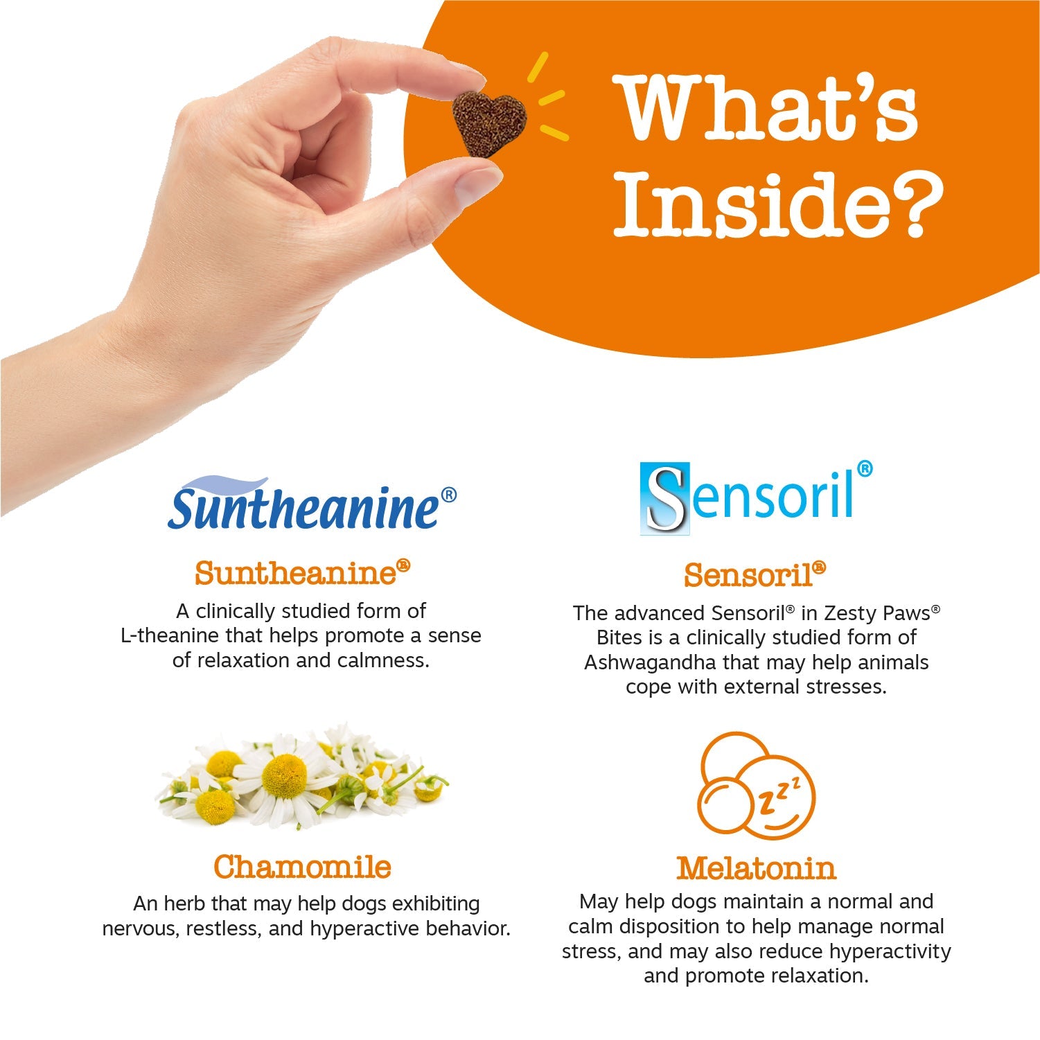 - Featuring Suntheanine - Every chew contains Suntheanine, a clinically studied and super premium form of L-Theanine that helps promote a sense of relaxation and calmness for your pup.