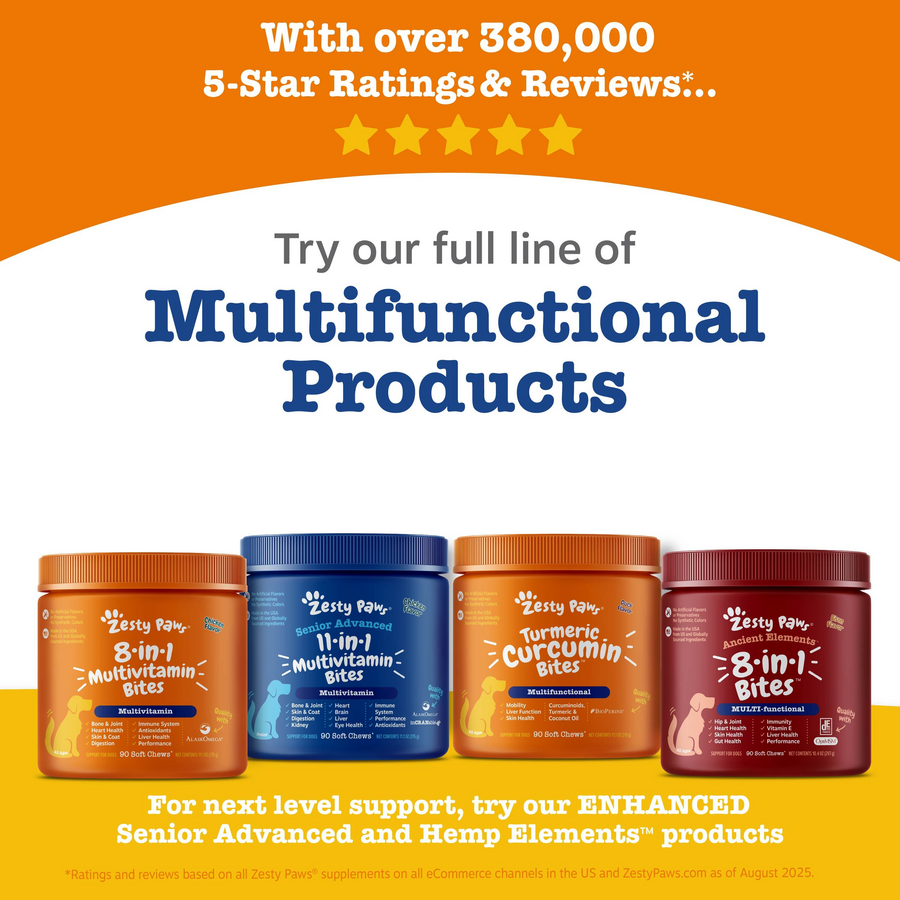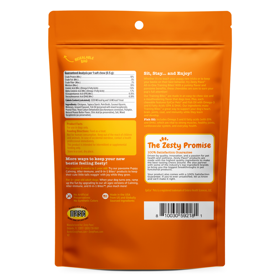 Whether it's to teach your puppy new tricks or to keep your bestie on their best behavior, try Zesty Paws All-in-One Training Bites! With a yummy flavor and pawsome benefits, these chewables are sure to earn your puppy's full attention! Training Bites are made in an easy-to-chew size and a mouthwatering flavor that puppies love. Plus, each chewable features EpiCor Pets® and Fish Oil with Omega-3 and 6 Fatty Acid (EPA & DHA) in every bite. These ingredients make Training Bites a great way to support your puppy’s healthy heart, brain, joints, muscles, coat, and immunity while they learn and grow. We also know your pup is anti-bad flavors. So best of all, these chews taste amazing, and are sure to give your pup an itch for more. You'll enjoy the daily relief of giving your pup the best treat for your pup's Zesty life, and Fido will wag their tail with joy because they’ll feel spoiled well with special treatment.