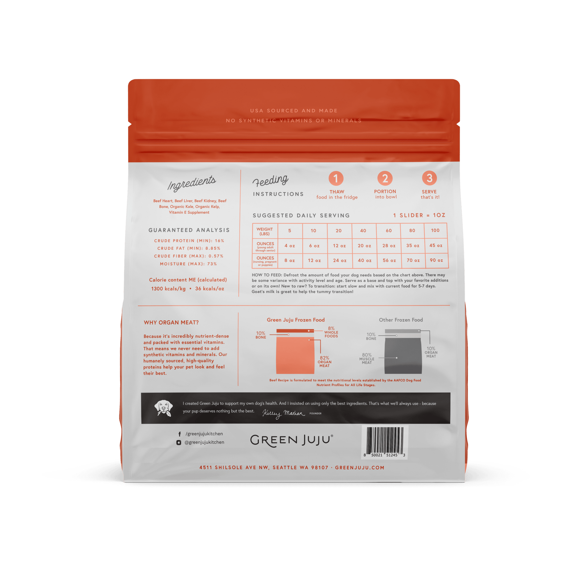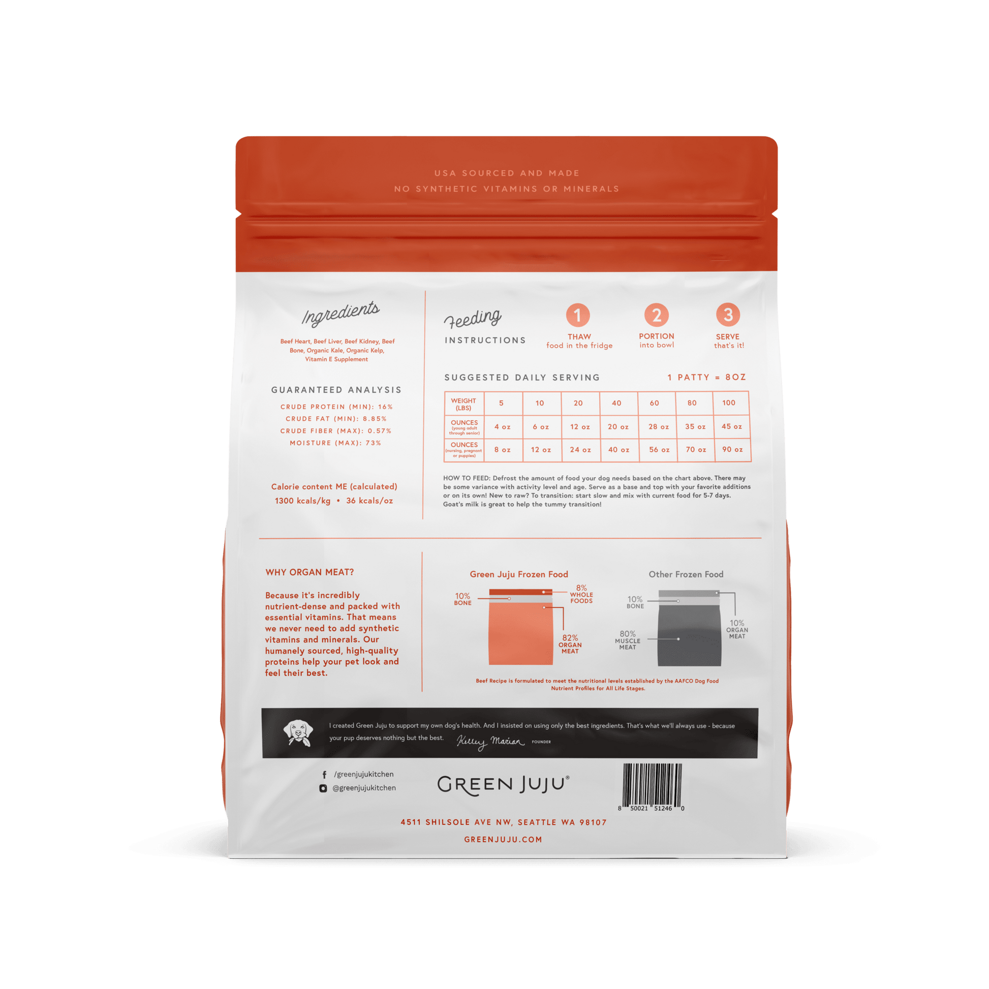 Ingredients: Beef heart, beef liver, beef kidney, beef bone, organic kale, organic kelp, vitamin E supplement