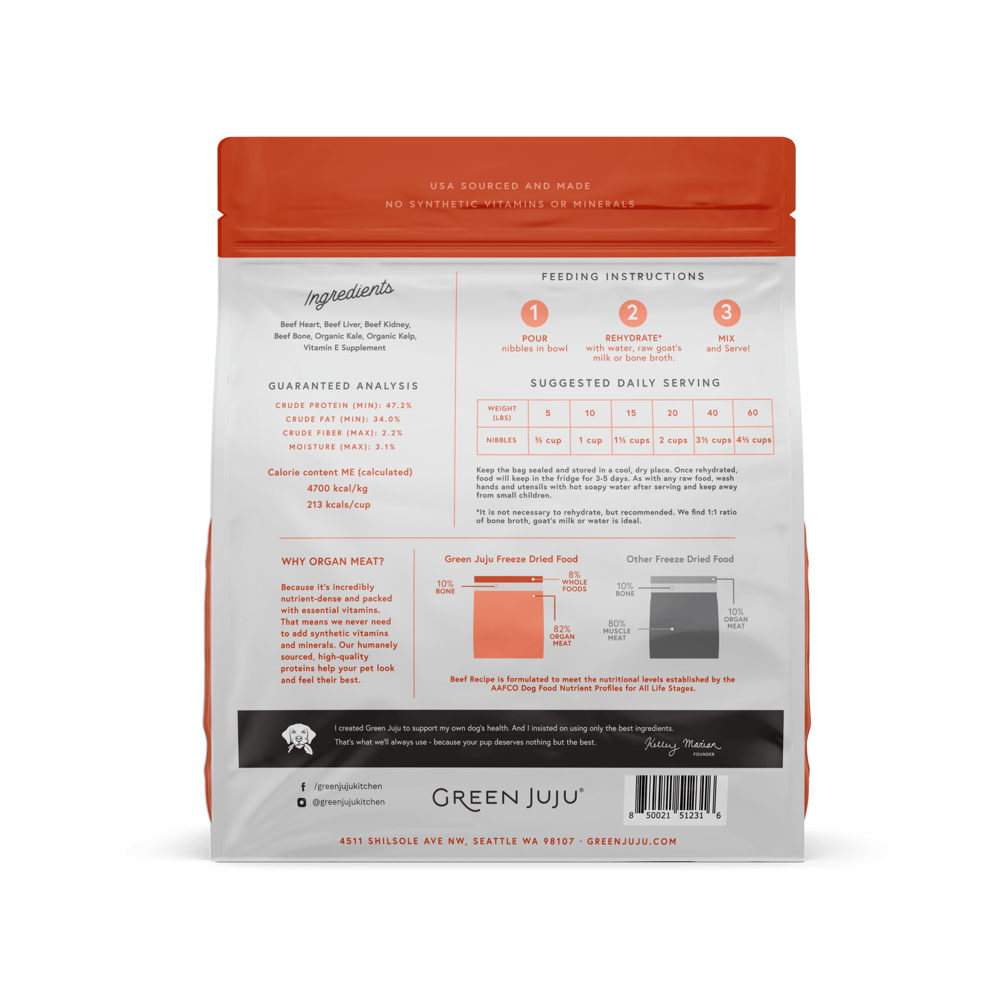 Ingredients: Beef heart, beef liver, beef kidney, beef bone, organic kale, organic kelp, vitamin E supplement