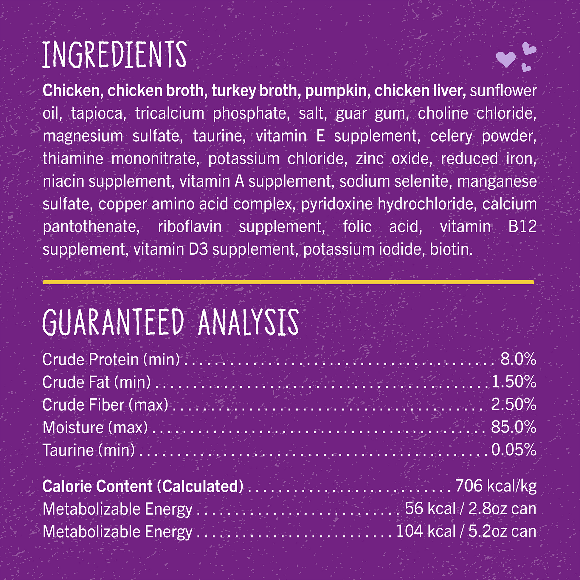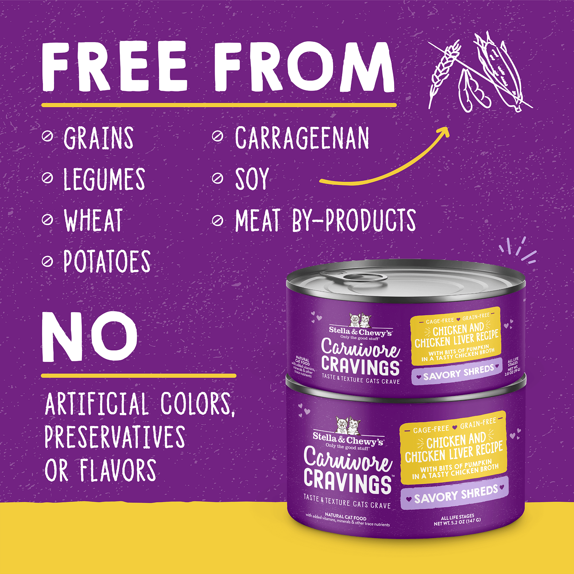 - Free from grains, legumes, potatoes, carrageenan, wheat, meat by-products, soy, artificial colors, preservatives and flavors