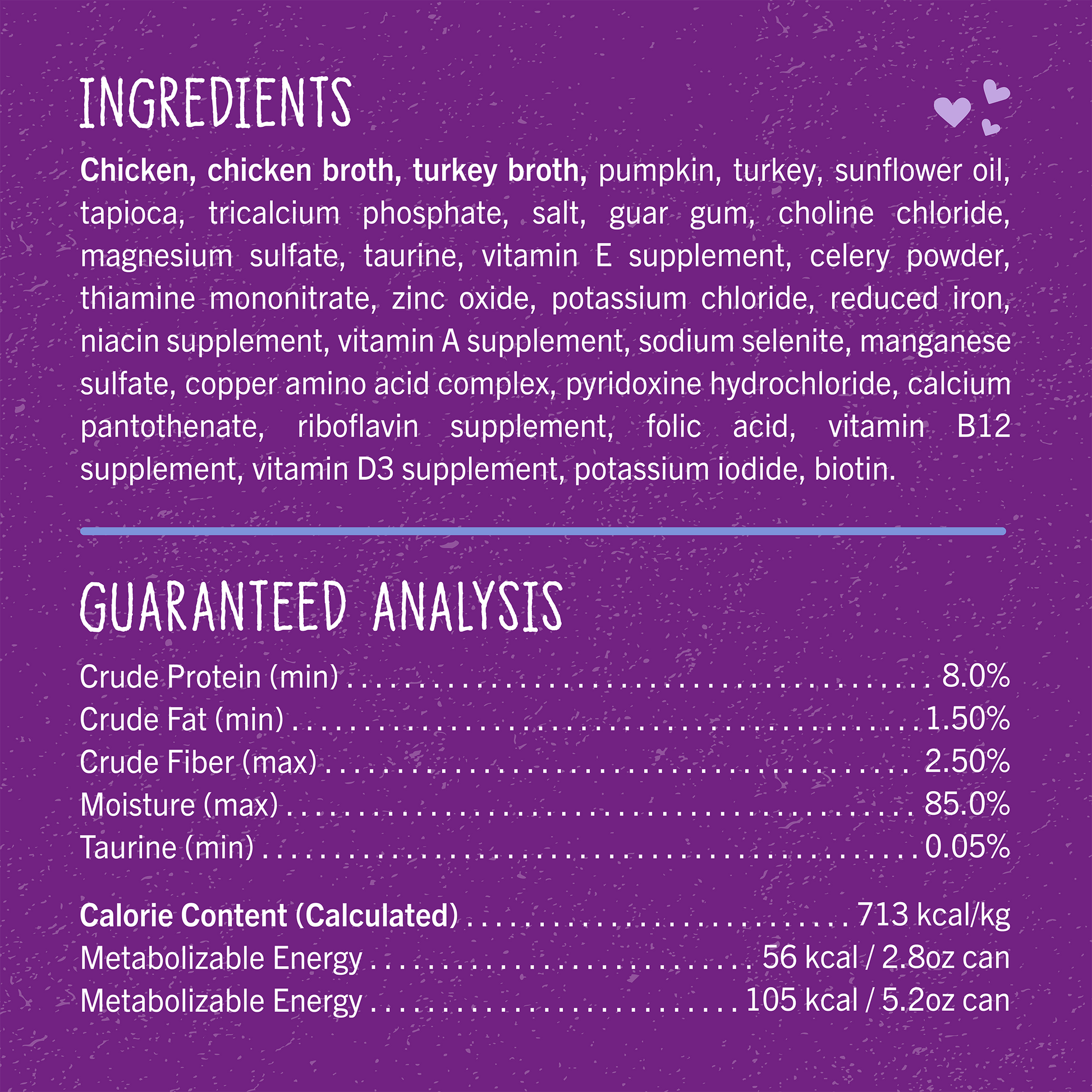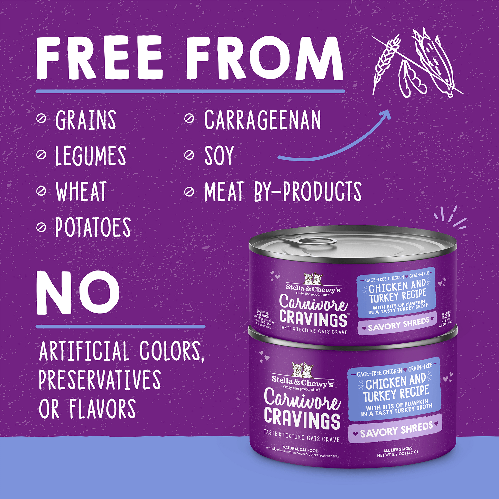 - Free from grains, legumes, potatoes, carrageenan, wheat, meat by-products, soy, artificial colors, preservatives and flavors
