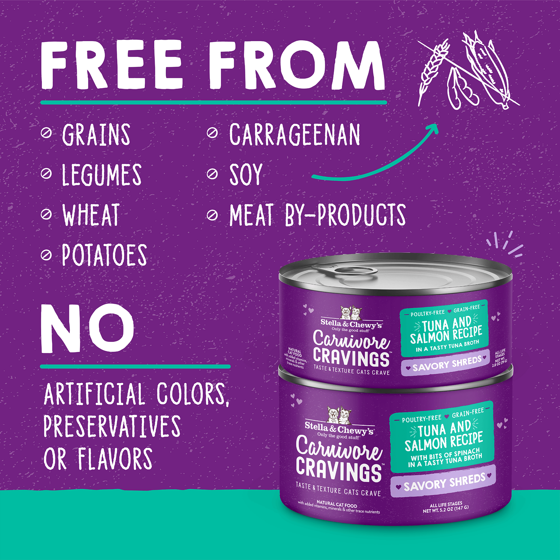 - Free from grains, legumes, potatoes, carrageenan, wheat, meat by-products, soy, artificial colors, preservatives and flavors