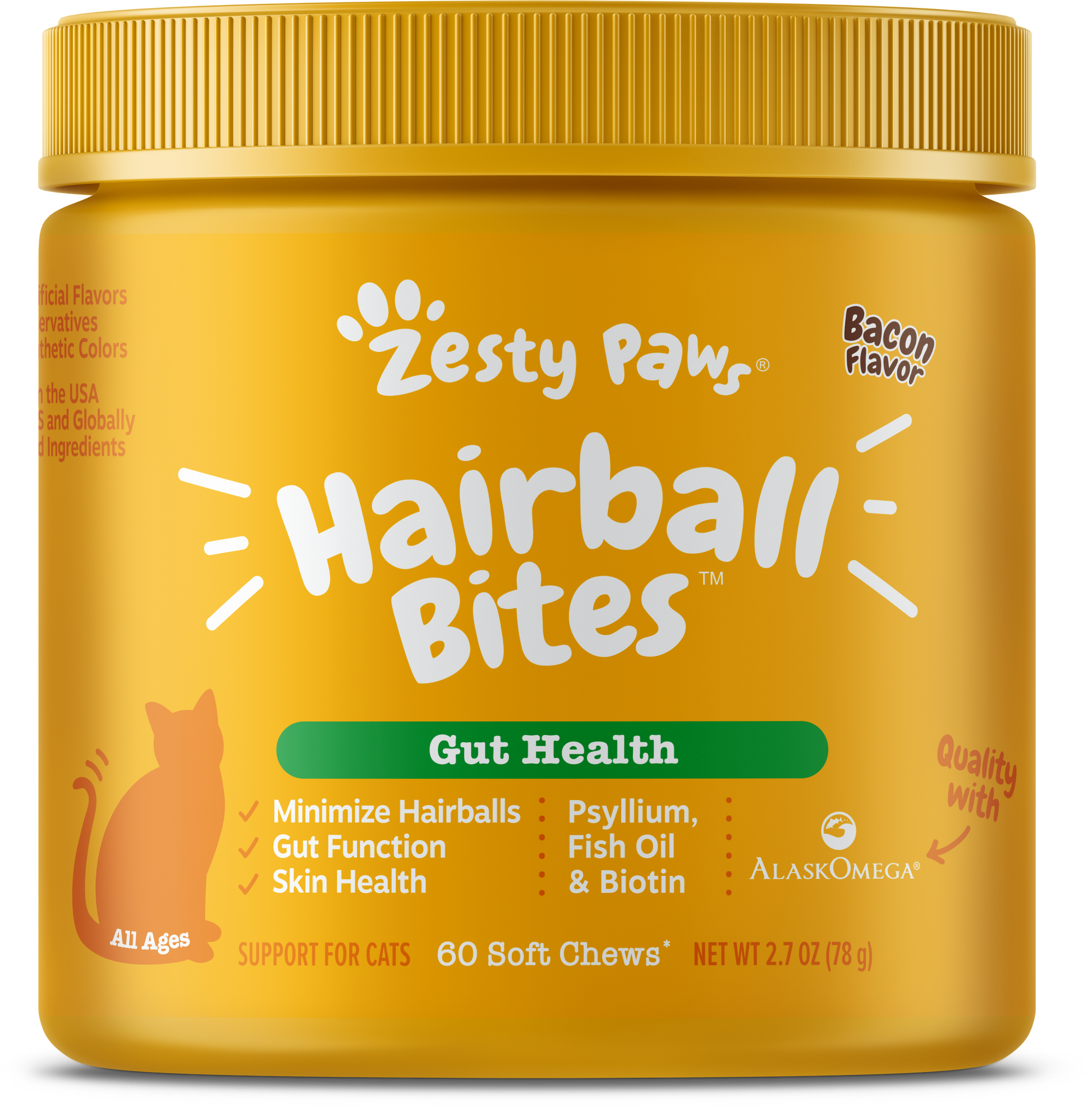 Of all the things your cat loves, it's only natural that hairballs probably aren’t one of them. That’s why Zesty Paws created Hairball Bites, a premium bite-sized soft chew that may help minimize hairball formation, while also supporting skin and digestive health for your favorite feline. Each chew features AlaskOmega Fish Oil, which provides a source of Omega-3 fatty acids that may minimize hairball formation and support skin health. Plus, each chew also includes Microcrystalline Cellulose, Psyllium, Slippery Elm, and a Proprietary Immune and Skin Function Blend (with Zinc and Biotin) for even more skin, digestive, and immune support. Best of all, pets love the delicious taste that’ll give your cat an itch for more. They’ll feel spoiled with special treatment that'll keep them feeling zesty, which treats you to a big sigh of relief and even more fun memories!