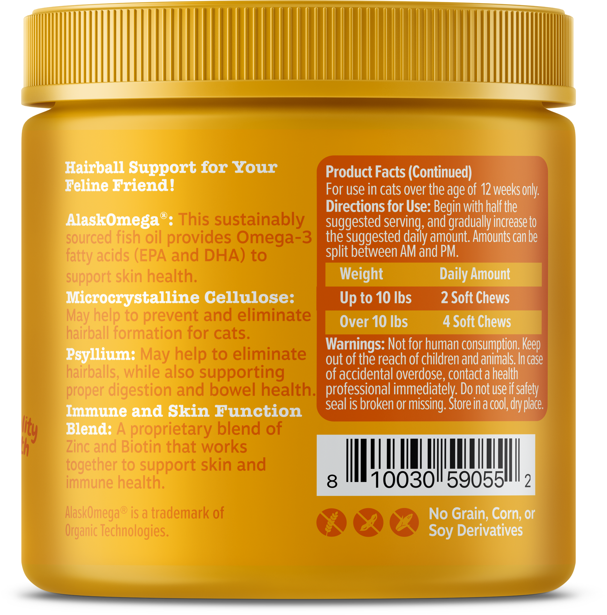 - Omega-3 fatty acid (EPA/DHA) to help minimize hair ball formation