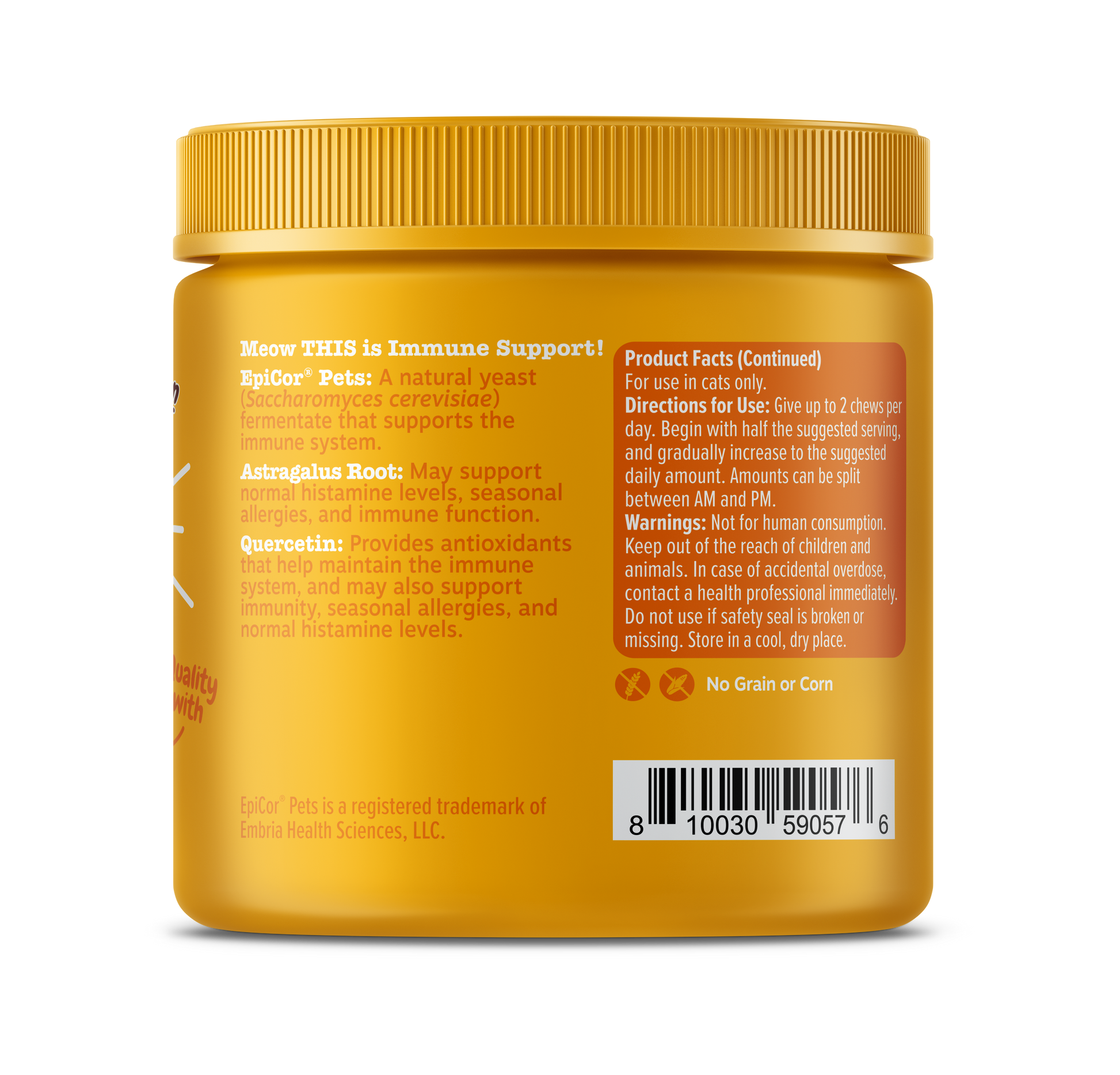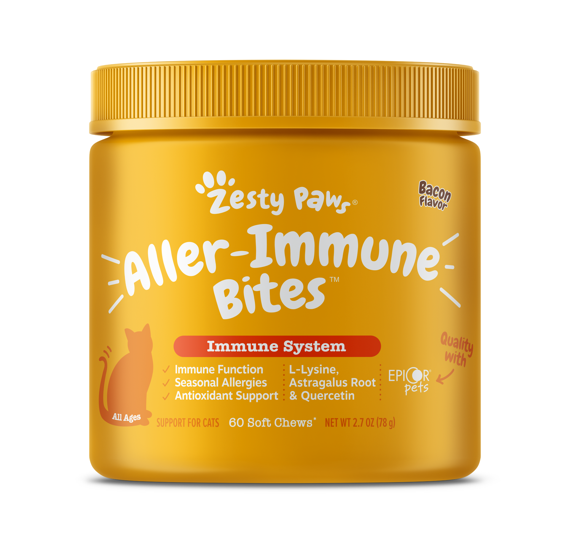 If your feline friend's immune system would like some extra TLC, Aller-Immune Bites can help! Featuring L Lysine, EpiCor, Astragalus Root, and Quercetin, these bacon flavored chewables are a great way to support immune function. Best of all, pets love the delicious taste (trust us, we have a hot spot where official four-legged testers tell us) that’ll give your cat an itch for more. They’ll feel spoiled with special treatment that'll keep them feeling zesty, which treats you to a big sigh of relief and even more fun memories!
