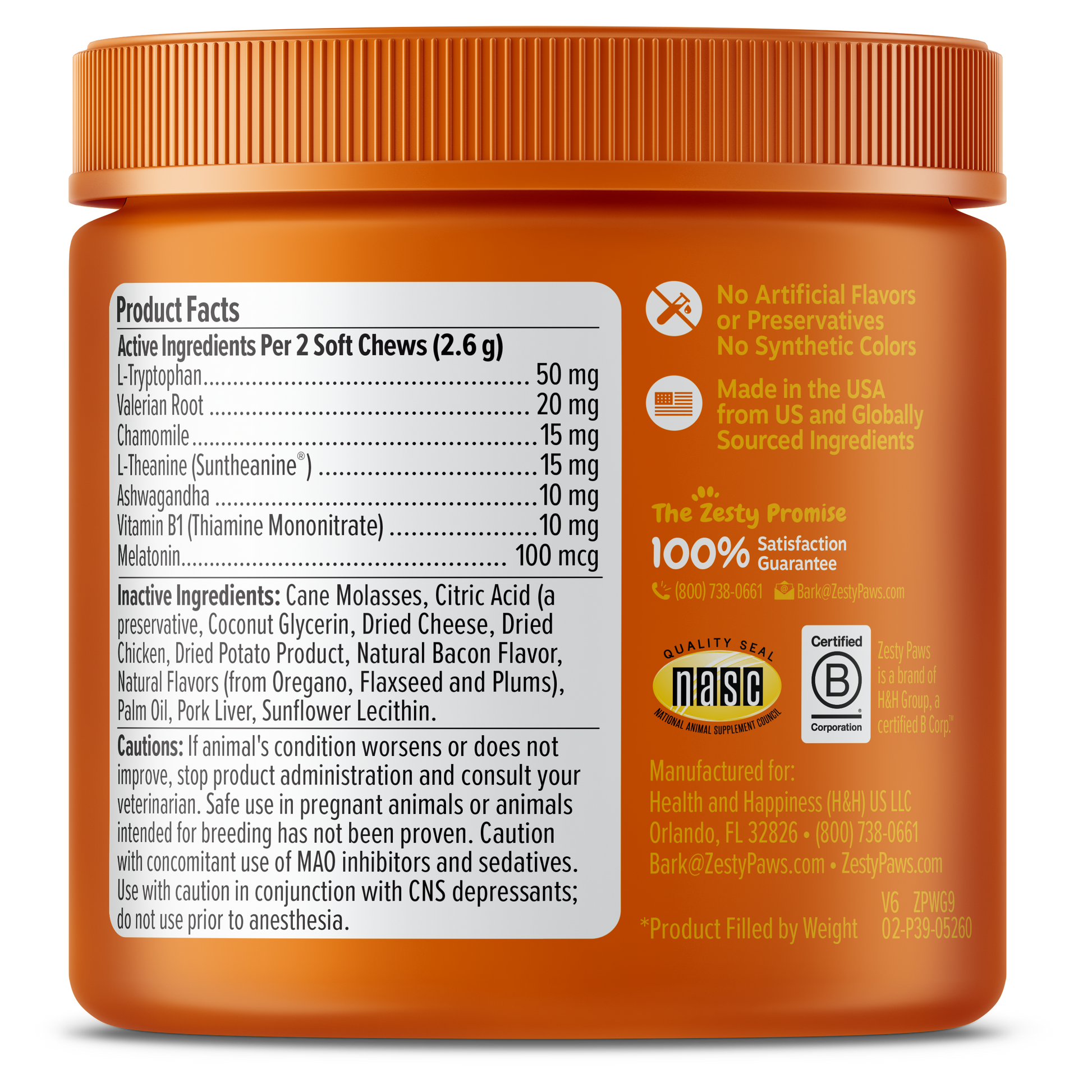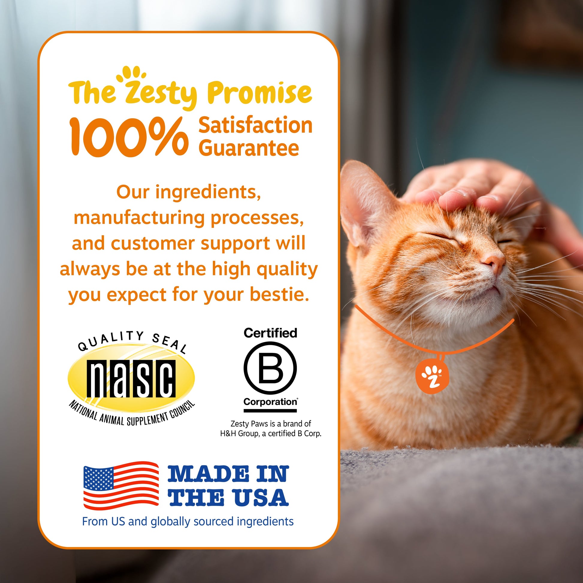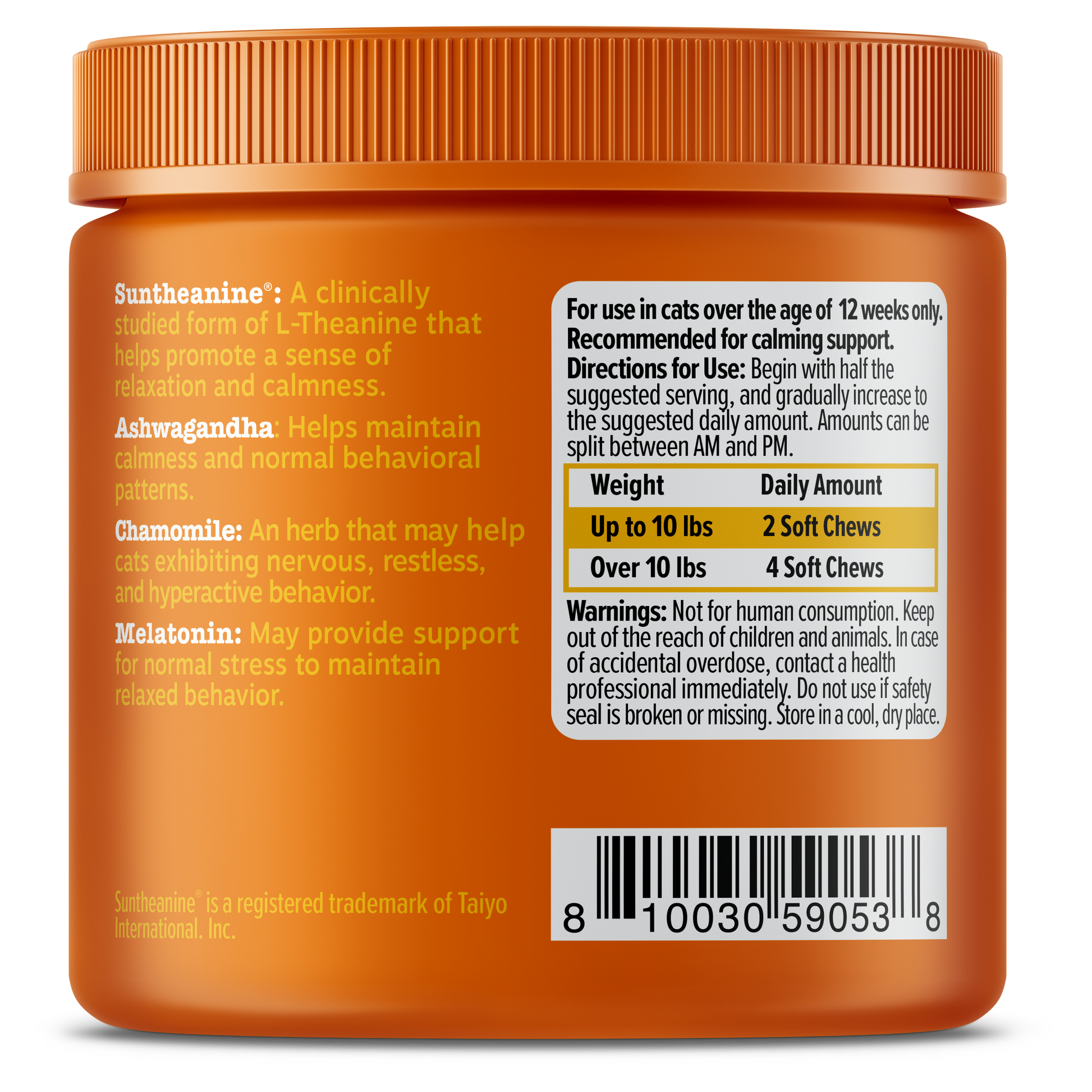 It's only natural that pet parents can sometimes feel the anxiety of finding products that can keep feline pets at ease, relaxing, and mellow. Well, now you can stop feeling anxious and relax! Calming Bites are the relief you're looking for if you need a functional supplement that can help your cat with normal stress! This functional chewable cat supplement features Sensoril Ashwagandha and Suntheanine, an advanced form of L-Theanine to support relaxation and calmness for your feline pet. Plus, these soft chews also include Valerian Root, Melatonin, Chamomile, Vitamin B1 (Thiamine Mononitrate), and L Tryptophan for additional support to keep your kitty companion calm. Best of all, cats love the delicious bacon flavor that’ll give your cat an itch for more. Also, pet parents can treat themselves to a sigh of relief knowing that their cat can maintain composure during thunderstorms, separation, everyday anxiety, neighboring cats and dogs, fireworks, car rides and travel, and other moments of normal stress. They'll feel happy and zesty, which treats you to even more good (and calmer) moments and memories!