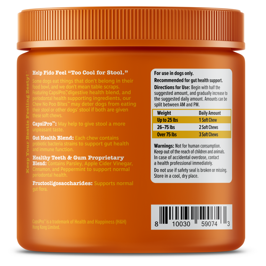 - Stool Eating Support – Chew No Poo Bites are tasty chewables made with functional ingredients that may help deter stool eating and provide gut, periodontal, and immune support.