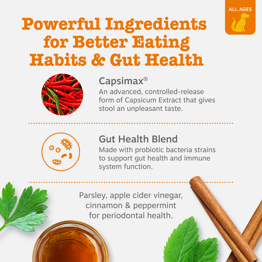 - Featuring Capsimax - These chews contain Capsimax, an advanced, controlled-release form of Capsicum Extract (chili) that gives feces a more unpleasant taste for a doggy with coprophagia.