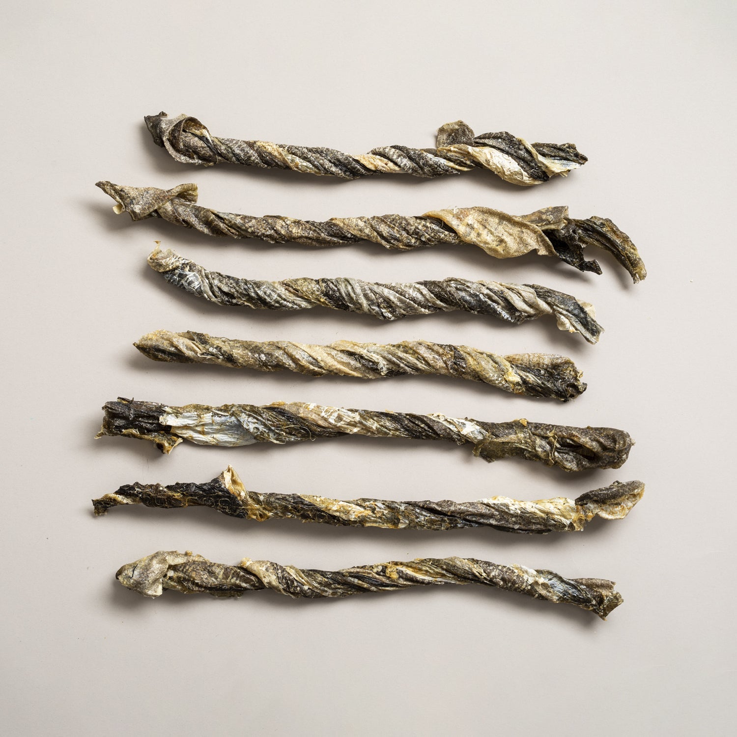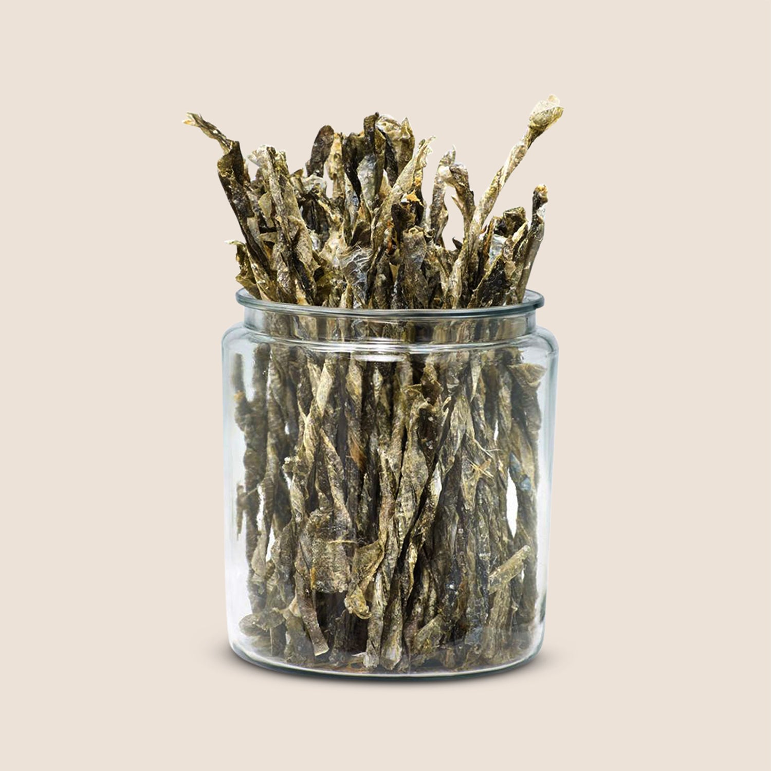 At Polkadog, we're all about locally sourced, made-in-the-USA, limited ingredient natural dog treats. Our super-duper fish skin dog treats are no exception. The cod we use to make these cod skins for dogs is caught wild in season by fishermen on small boats in Alaska. We hand-roll and slowly dehydrate each skin in our Boston kitchen to create these crunchy, savory, healthy cod skin treats.