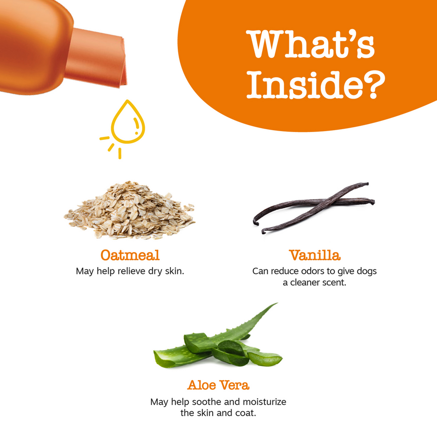- This shampoo includes oatmeal to help relieve dry skin and Shea Butter to help support healthy skin for dogs.