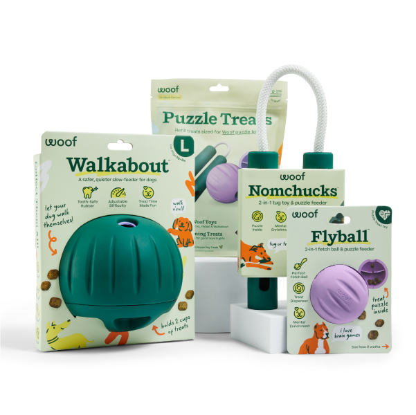 Your starter set for smarter, more active play—three 2-in-1 toys and matching Woof Puzzle Treats.