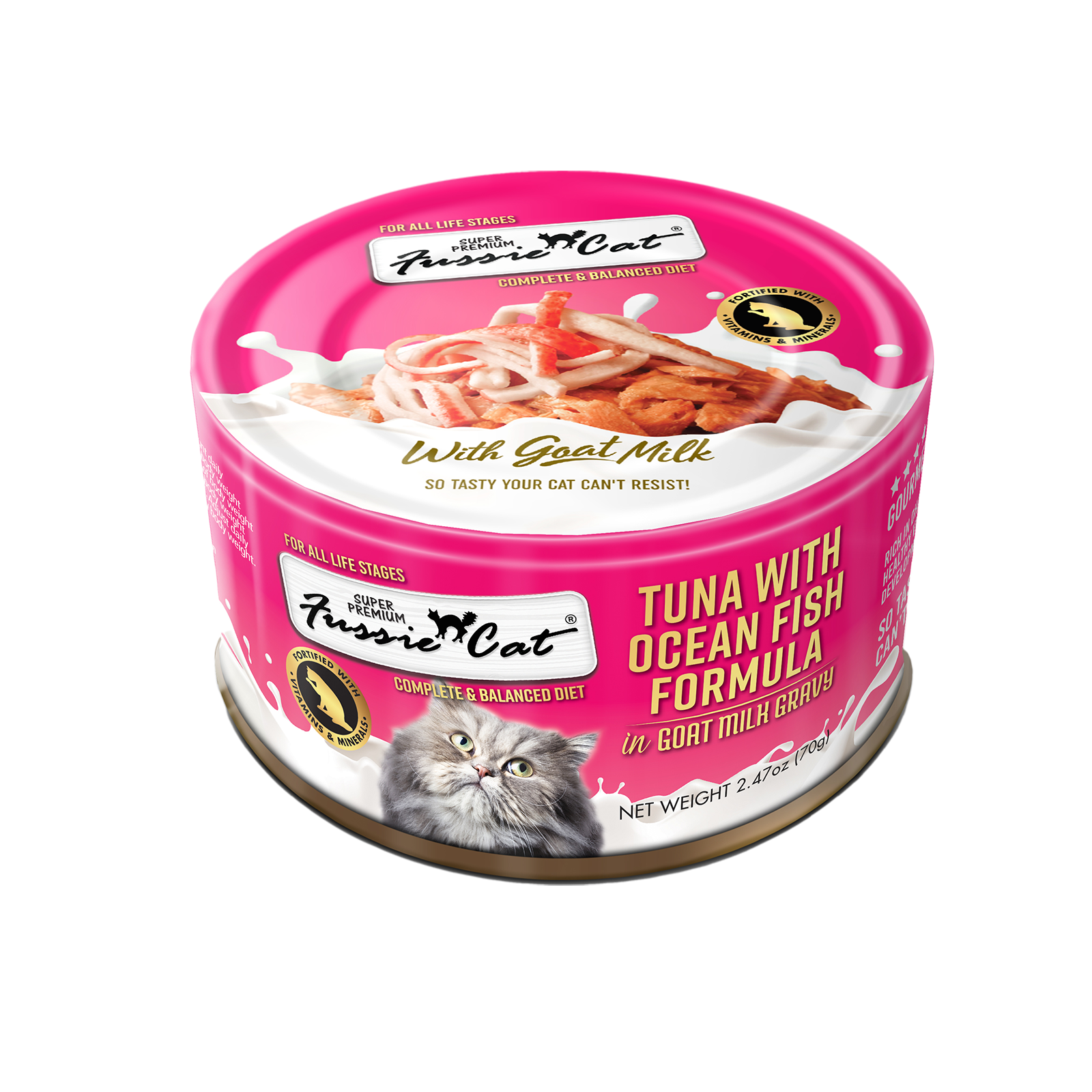 Introducing our newest line to the Fussie Cat family, Fussie Cat with Goat Milk! Our new line of gourmet cat food features delicate, tender bites of tuna with a creamy goat milk gravy to make up a complete and balanced diet for your carnivore’s connoisseur! Fussie Cat with Goat Milk is rich in DHA to help support healthy vision and brain development and is fortified with vitamins and minerals.