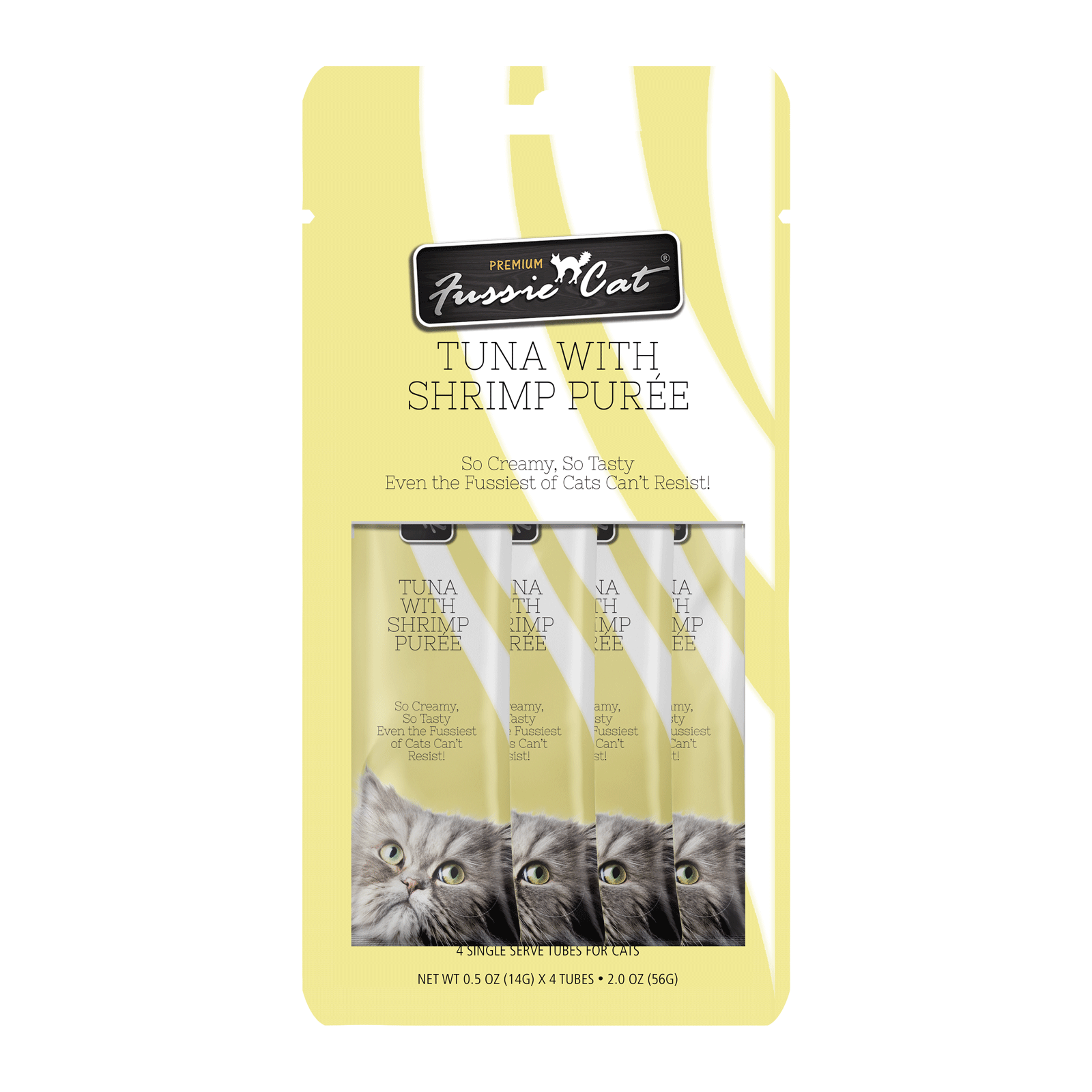 Fussie Cat Tuna with Shrimp Purée is love at first lick. Creamy in texture and rich in taste, this indulgent, flavorsome puree will make even the Fussiest of Cats demand more! Fussie Cat Tuna with Shrimp Purée is an easy-to-feed cat treat with essential vitamin E for your cat’s diet to support healthy skin and coat.