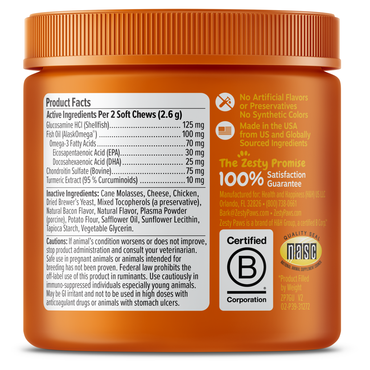 Whether they’re tackling a ball of yarn or chasing a laser pointer, your cat loves staying nimble to keep enjoying their Zestiest activities - big or small! So, it's only natural that you would want to help them stay that way. But, finding a supplement to keep your cat feeling active and happy can be a real pain. But, Zesty Paws is here to give you some relief in your search. With Hip & Joint Bites, you can spoil your kitty companion with premium ingredients, functional benefits, and a meow-worthy flavor that keeps them purring for more. That's because these soft chews feature Glucusamine HCl, Chondroitin Sulfate, Turmeric Extract, and premium AlaskOmega Fish Oil with omega fatty acids (EPA and DHA). Together, these ingredients help to support your cat's hips, joints, cartilage, connective tissue, and lubrication to keep the pep in their step. Best of all, your pet will feel happy and spoiled with special treatment thanks to the delicious flavor, while you no longer have to deal with the hassle of giving them big pills or tablets.
