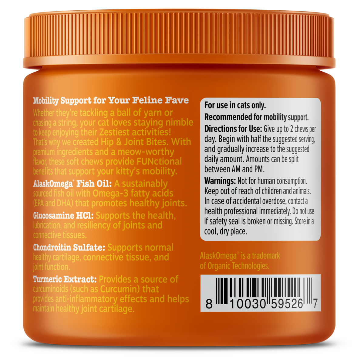 - Hip & Joint Support for Your Feline Fave – Hip & Joint Bites are functional soft chews with ingredients (including a Glucosamine Chondroitin duo) that support mobility for cats of all ages.