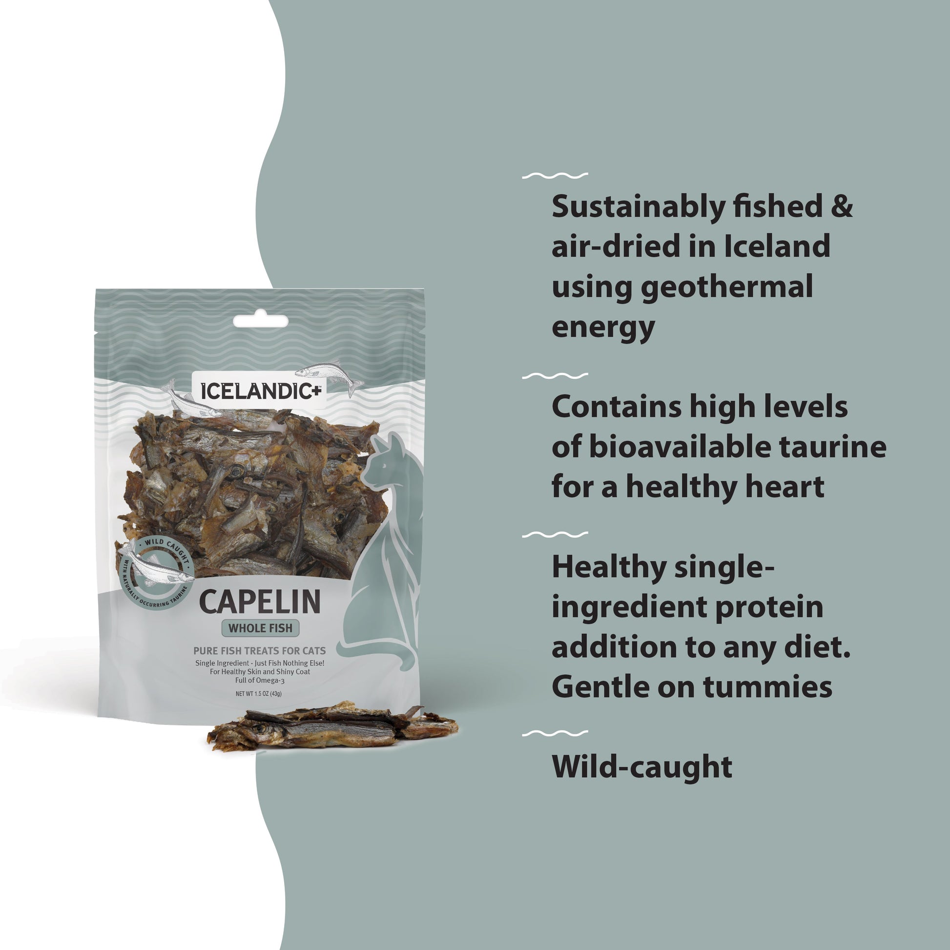 Treat your cat to the delicious taste and satisfying crunch of our Capelin Whole Fish & Pieces Cat Treats—made with just one ingredient: wild-caught Capelin from the pristine waters of Iceland. Naturally air-dried to lock in flavor and nutrients, these all-natural treats meet strict FDA, USDA, EU, and MAST standards for quality and safety.