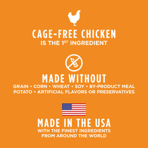 Made with cage-free chicken plus vibrant, functional whole-food ingredients likes pumpkin, sweet potato, chicory root, apple cider vinegar & probiotics