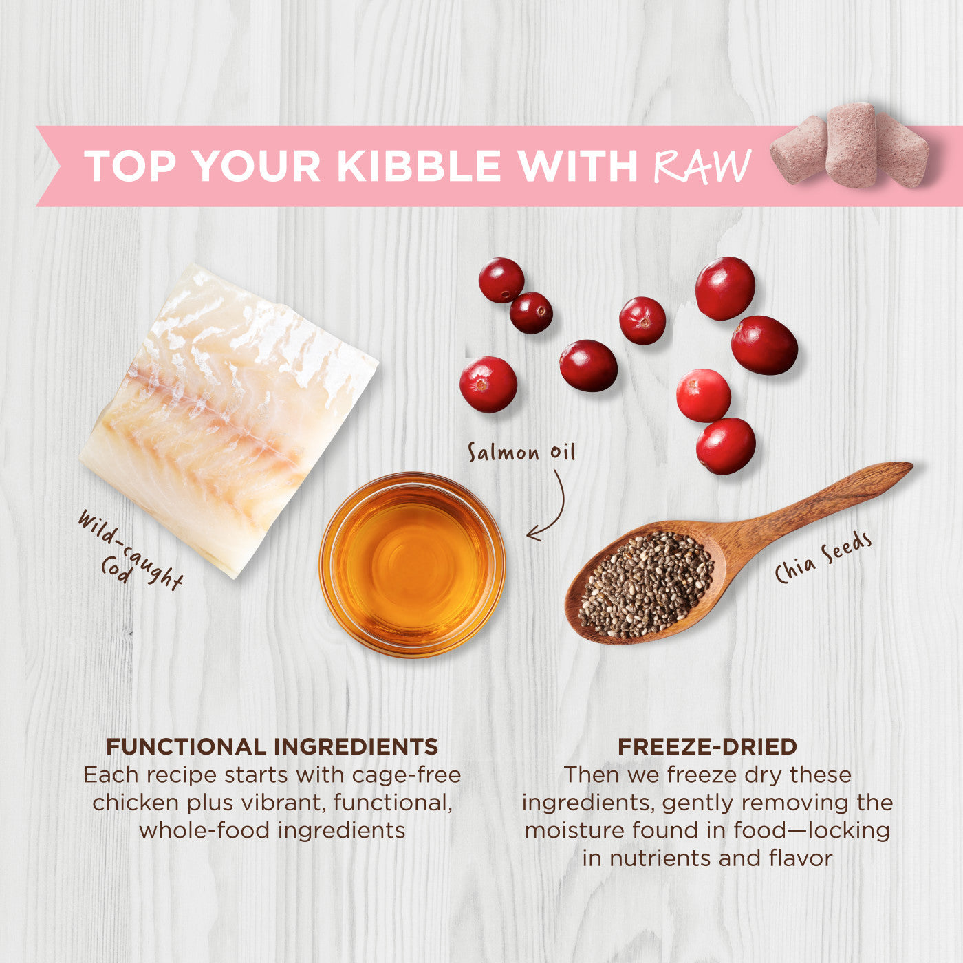 - Raw, whole-food ingredients are freeze-dried to gently remove the moisture, while locking in nutrients and flavor