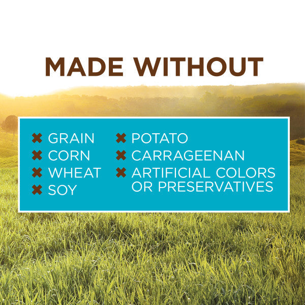 Made without - grain, potato, corn, wheat, soy, by-product meal, artificial colors or preservatives