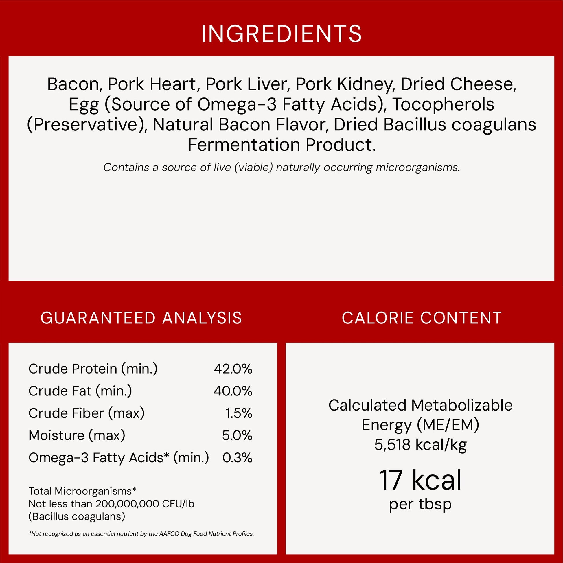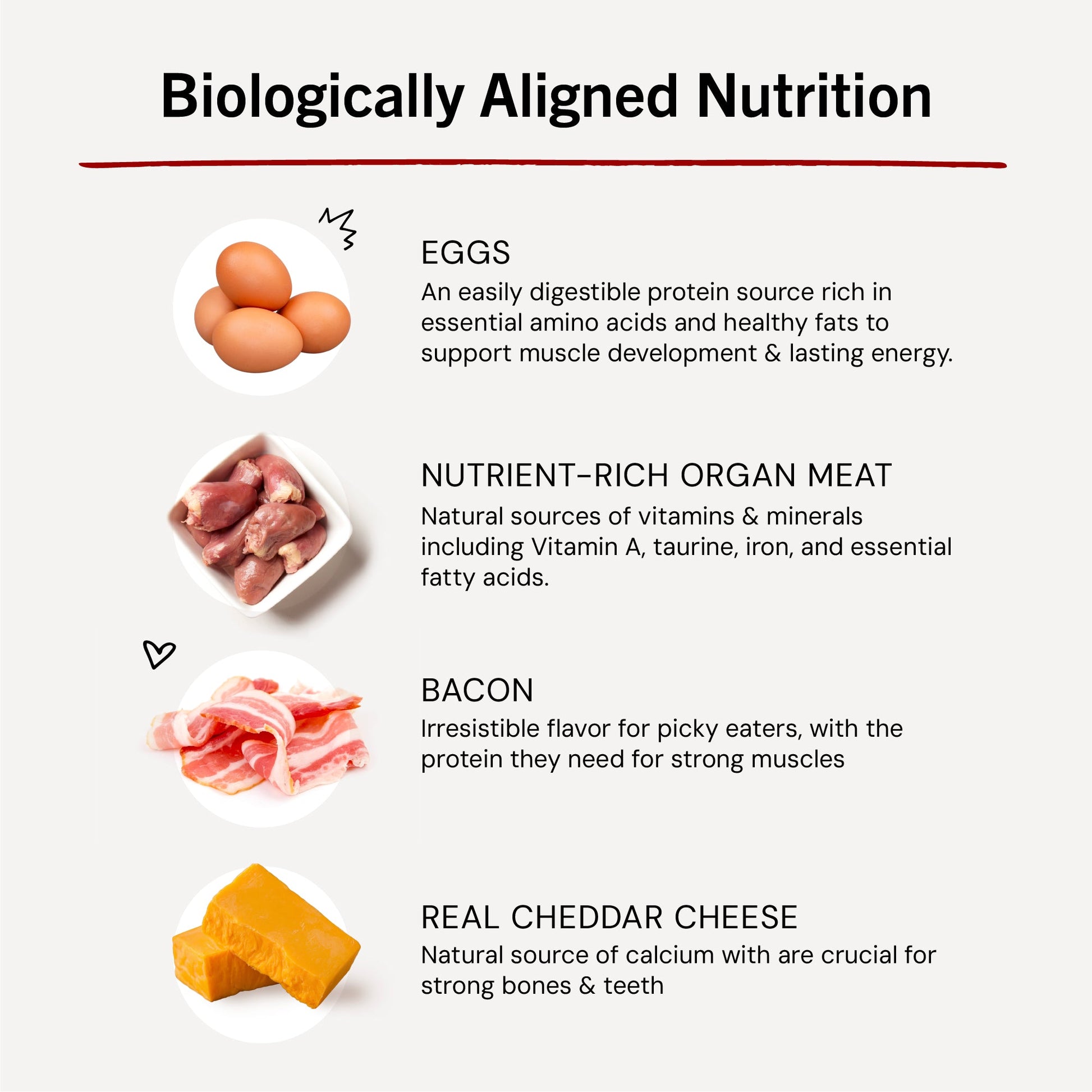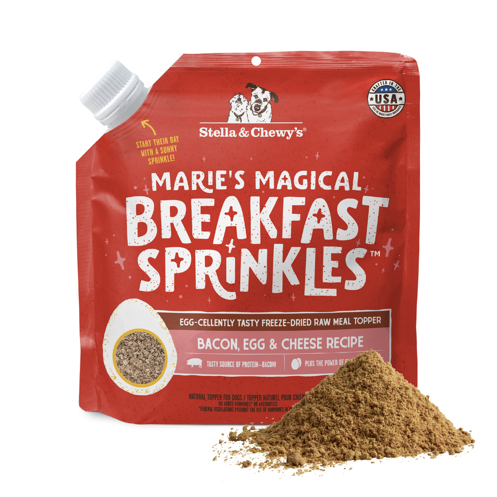 - Perfect for picky eaters—a sprinkle of freeze-dried bacon, egg, and natural cheddar cheese that adds irresistible flavor to your pet’s breakfast.