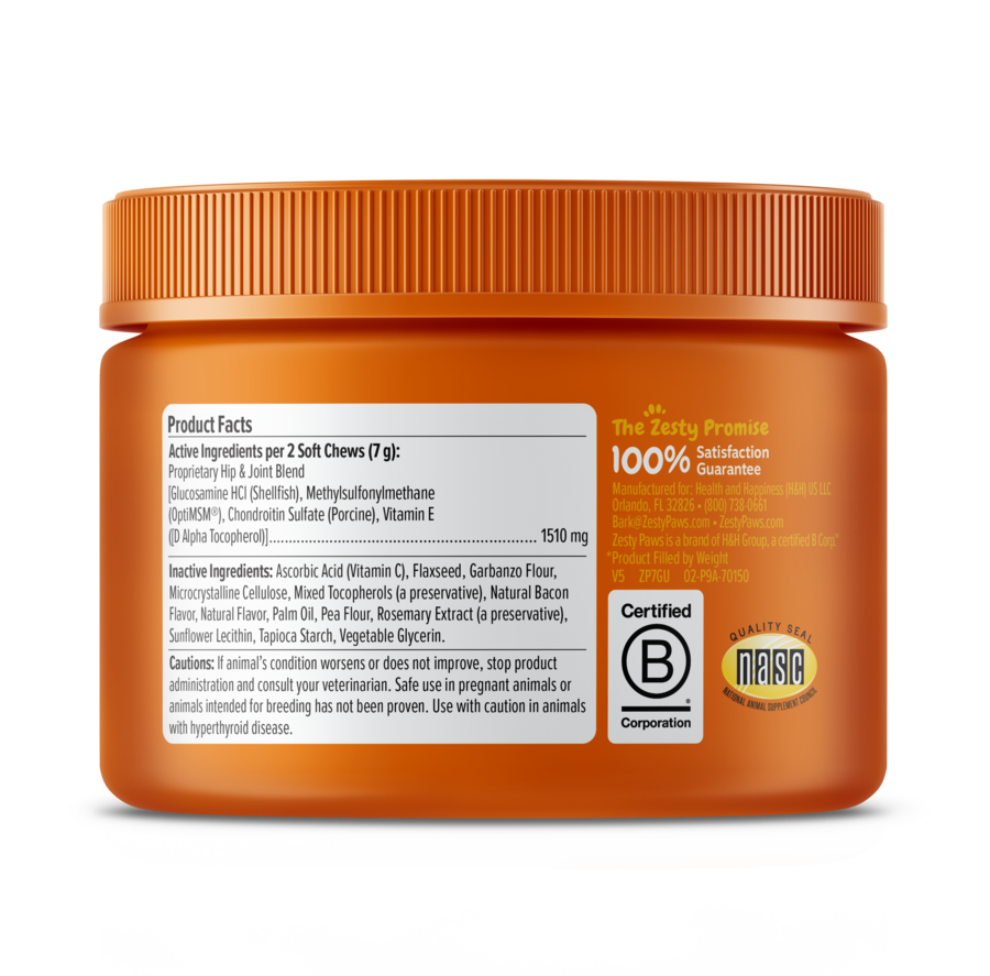 If Fido is a natural at fetch, don’t let that frisbee start to collect dust! Zesty Paws Hip & Joint Bites can help. This functional chewable dog supplement features OptiMSM, a form of MSM that provides premium muscular support, plus Glucosamine HCl and Chondroitin Sulfate to support hips, joints, connective tissue, and cartilage for canine pets.
