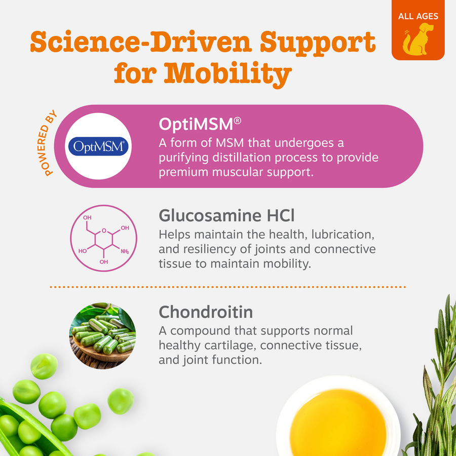 - Featuring OptiMSM – At 500 mg per 2 chews, OptiMSM is a premium form of MSM (Methylsulfonylmethane) that undergoes a purifying distillation process to help provide muscle support for your dog.