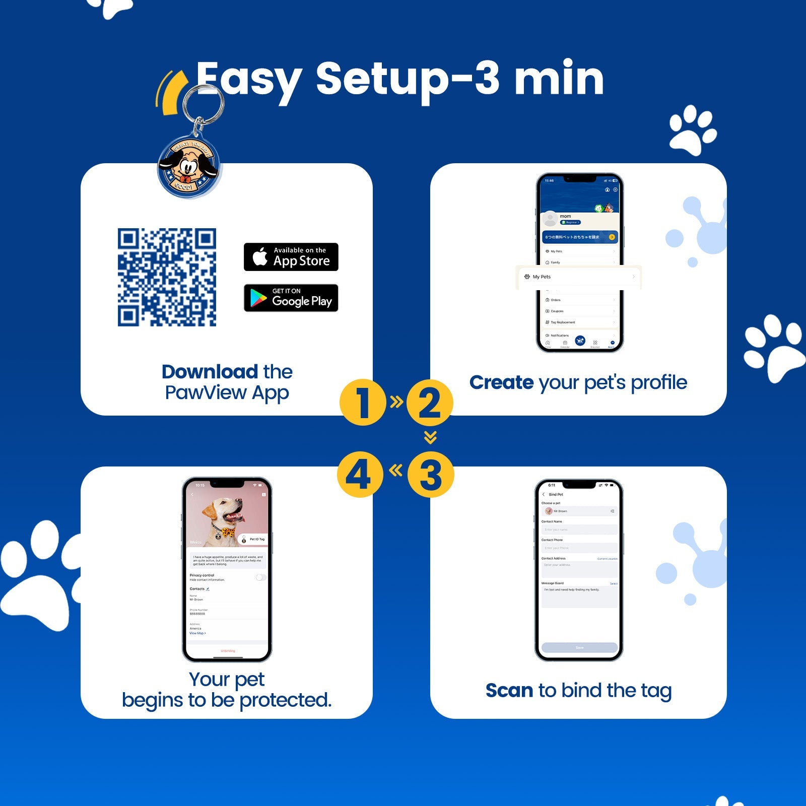 [Smart QR Code Technology] Each pet tag comes with a scannable QR code that links directly to your pet's profile and your contacts, making it easy for anyone to contact you if your pet is found. And at the same time, you can receive a scan alert and pet's instant location. Furthermore, within the PawView app, you can effortlessly generate a pet lost poster, and you can print or seamlessly share it across social media or community