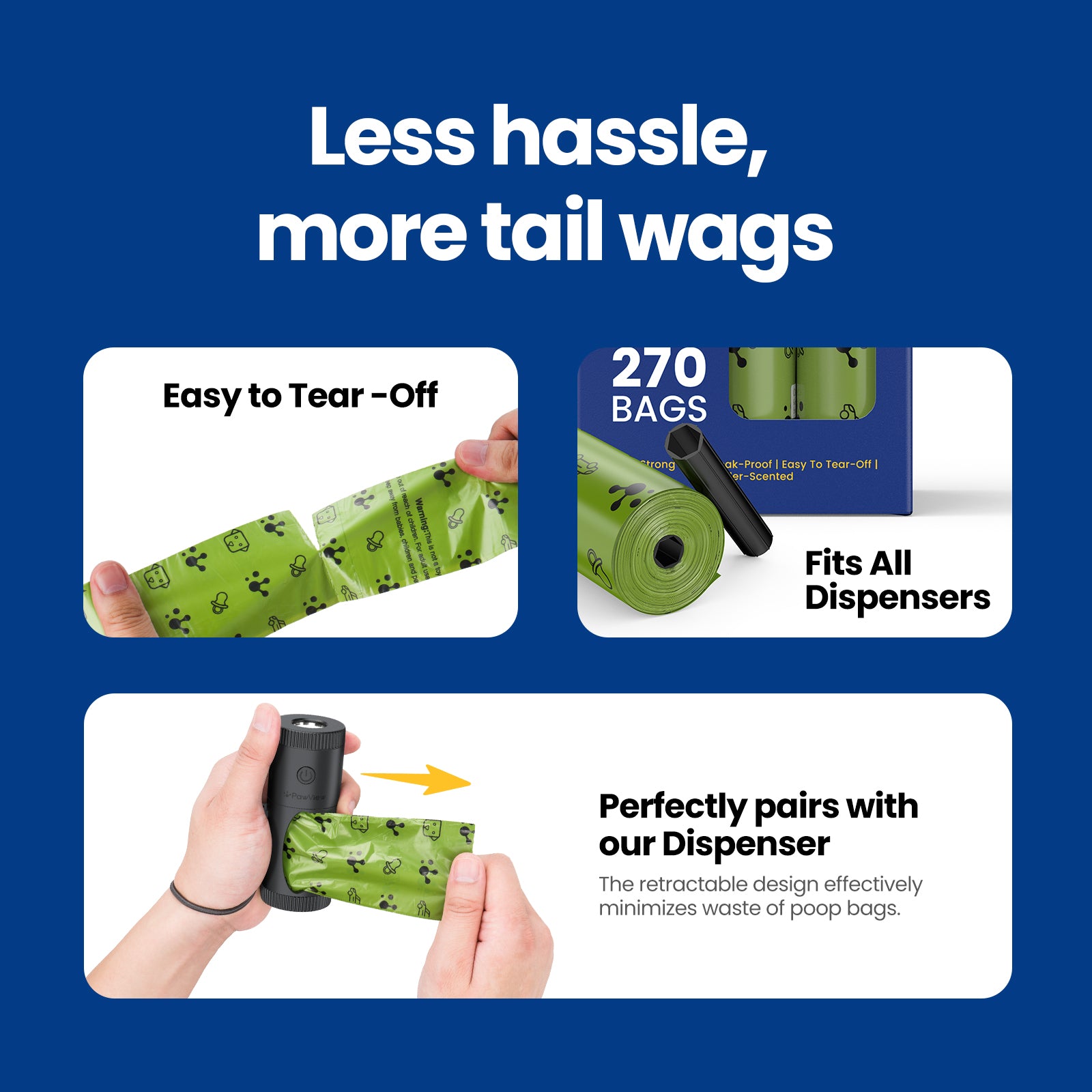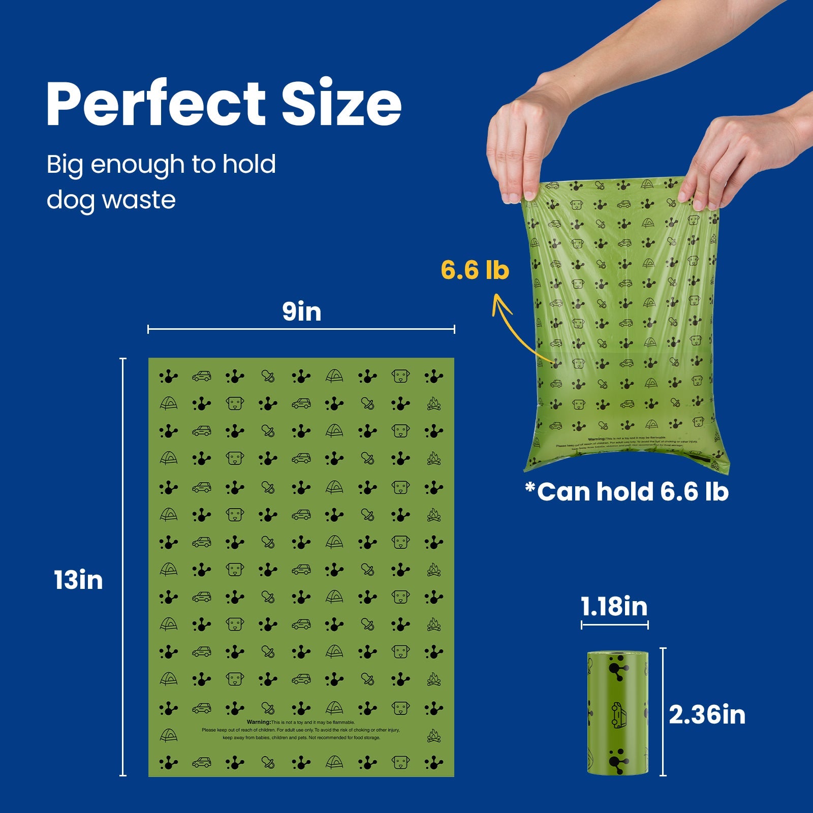 • EXTRA-LONG FOR COMFORTABLE CLEANUP: Our dog poop bags are designed to be extra-long and large enough, providing the flexibility to handle waste of any size, even for larger breeds