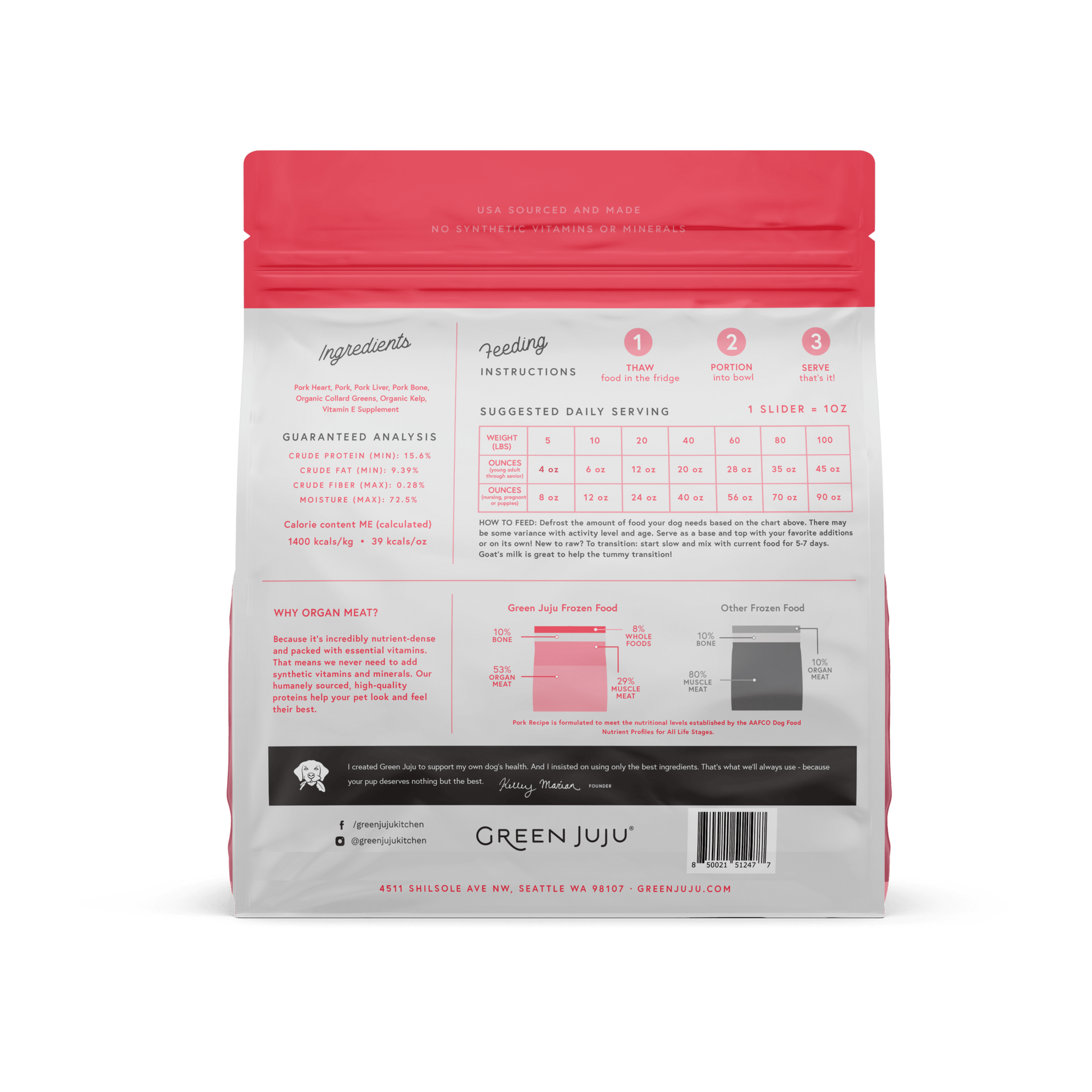 Ingredients: Pork heart, pork, pork liver, pork bone, organic collard greens, organic kelp, vitamin E supplement