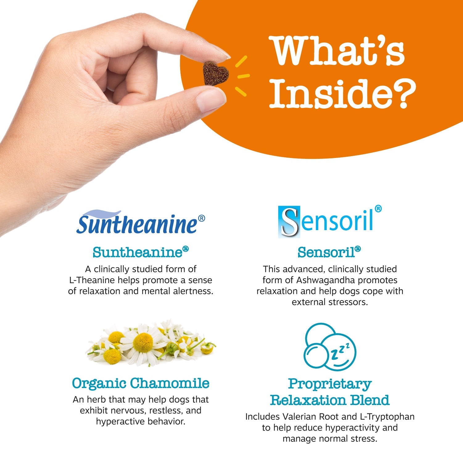 - Featuring Suntheanine - Every chew contains Suntheanine, a clinically studied and super premium form of L-Theanine that helps promote a sense of relaxation and calmness for your pup.