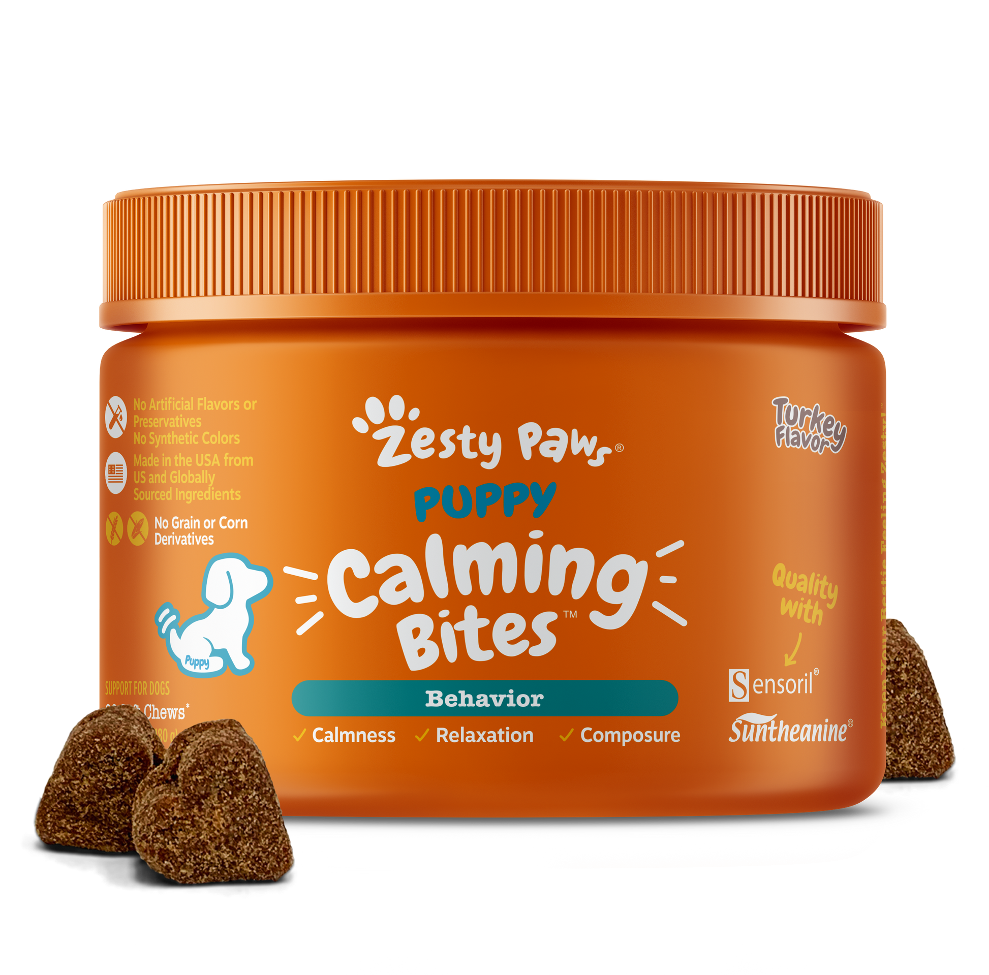 It might feel like a big (and slightly scary) world out there for your puppy, so help them adjust with our Puppy Calming Bites. Whether it’s for thunderstorms, fireworks, people, or other pets, our veterinarian-formulated soft chews help to keep your puppy feeling pawsome for all the firsts of their Zesty new life! This functional dog supplement features Suntheanine, an advanced form of L-Theanine along with Ashwagandha. Together, these ingredients help support relaxation for your canine pet. Plus, these soft chews also include Chamomile, Valerian Root, and L-Tryptophan for additional support to help your pup stay calm!