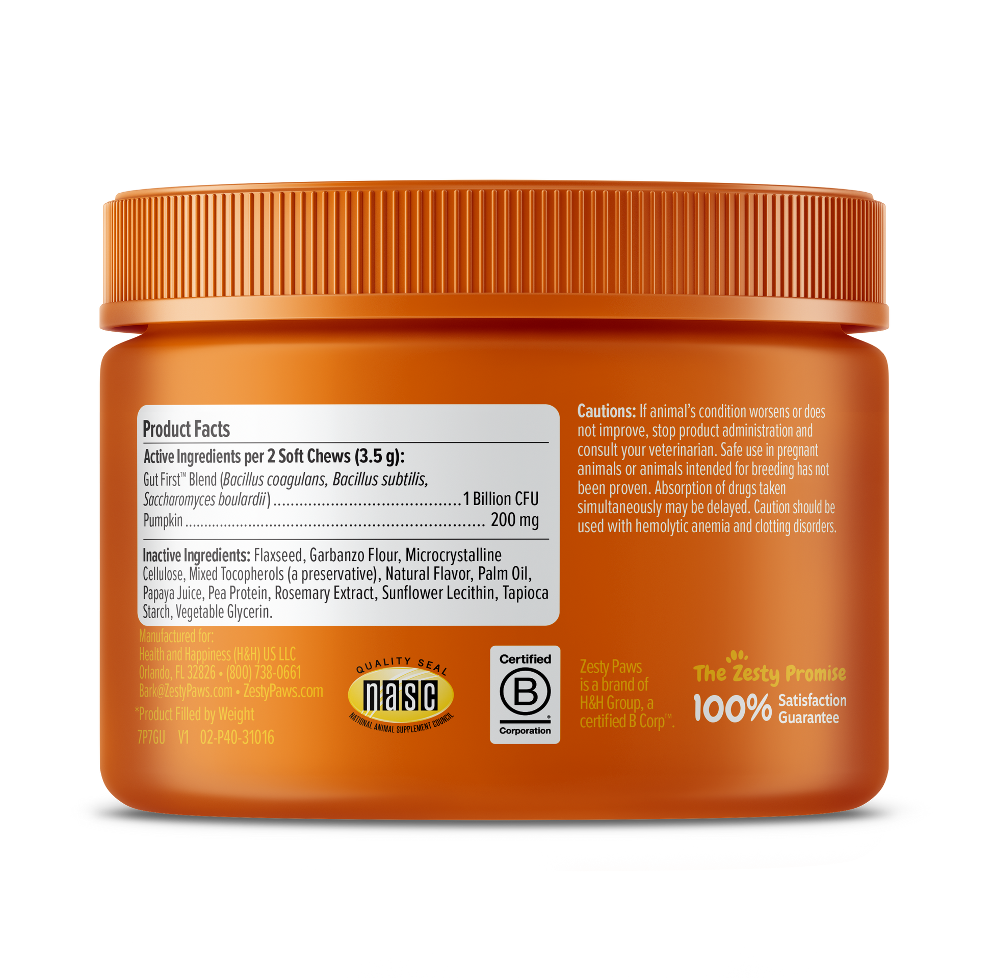 As pet parents, we want nothing but the best for our furry companions, especially when it comes to their health. That’s why Zesty Paws Probiotic Pumpkin Flavored Soft Chews Gut Health Supplement for Puppies, specially formulated to support your little one’s tummy health and overall well-being. This supplement features the Gut First Blend, a premium blend of three beneficial bacteria strains that support digestion, bowel health, and immunity. Made with probiotics and pumpkin, these soft chews support healthy gut flora and digestion, while also promoting firm stool consistency for small puppies. With a delicious chewable formula, these bites are the perfect way to give your puppy a boost of good vibes and keep their gut health in check.