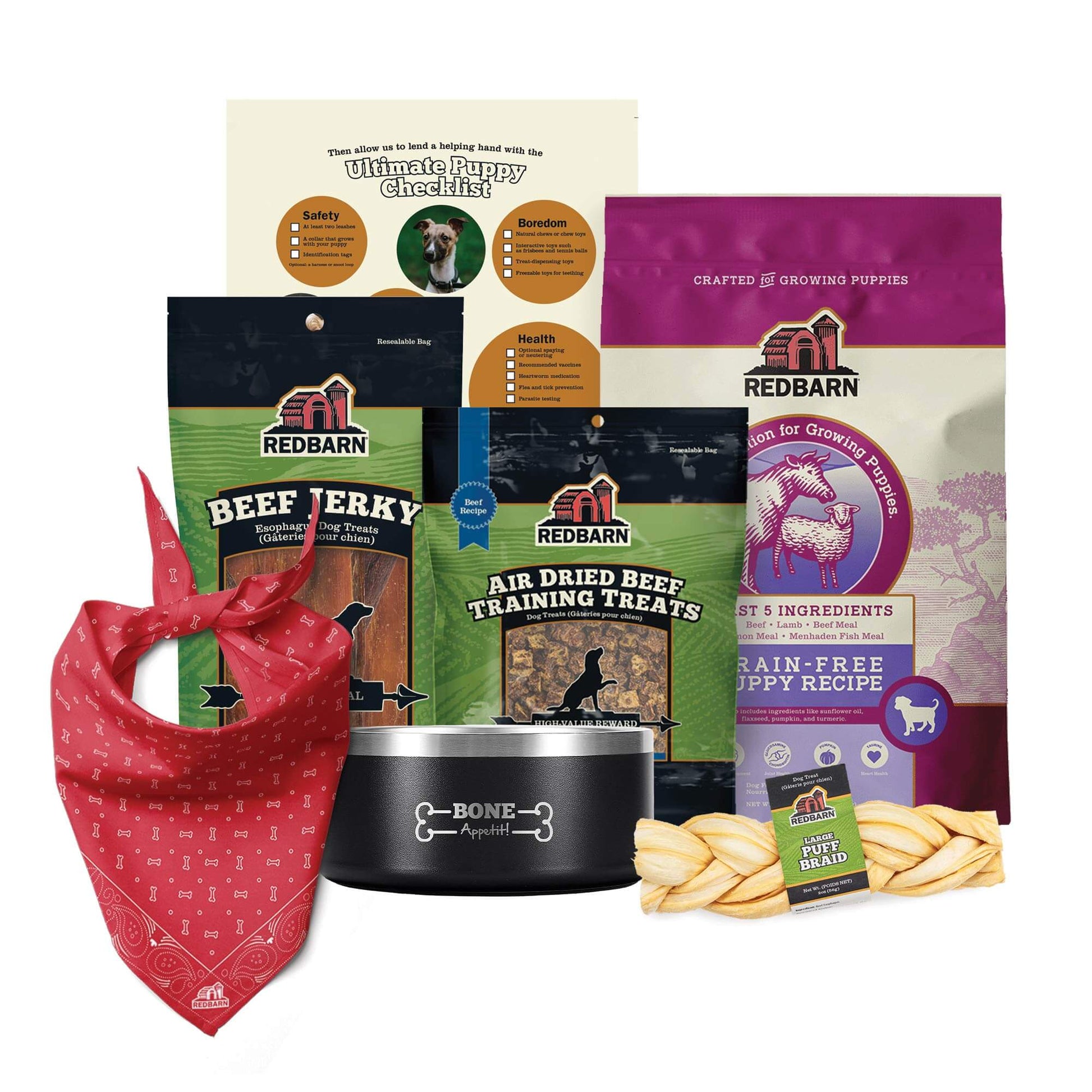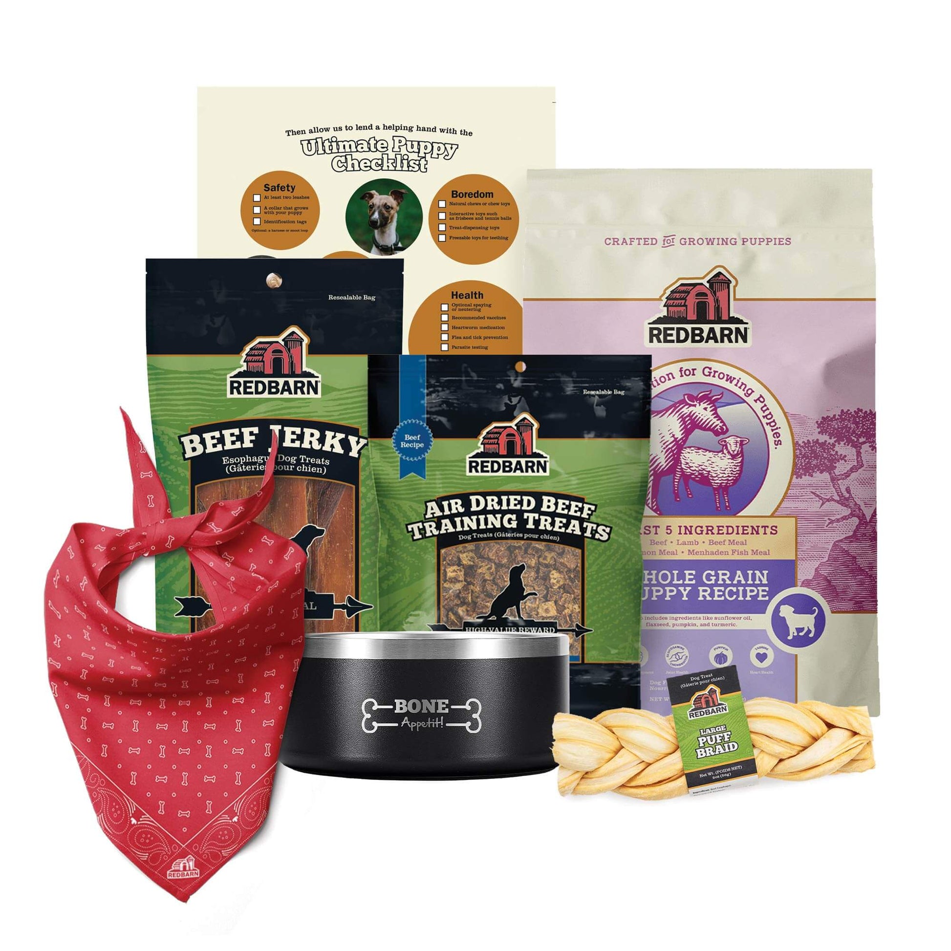 Bringing home a new puppy is an occasion filled with love and excitement. That's why we've crafted the perfect Puppy Starter Pack, complete with a durable bowl, nourishing puppy dog food, healthy training treats, and a charming bandana, a single-ingredient chew to keep them busy, and a snack on the go, Beef Jerky! Everything your new furry family member needs for a tail-wagging welcome home. Trust in our commitment to quality and care for your puppy's well-being!