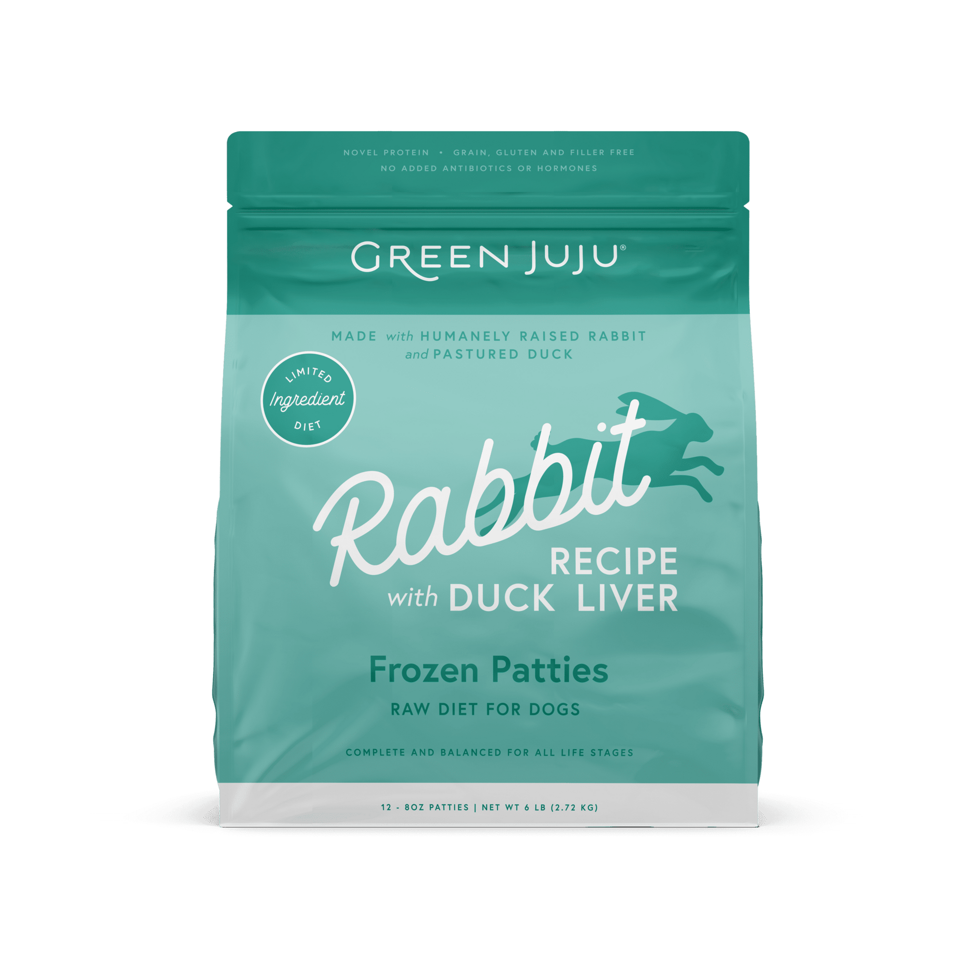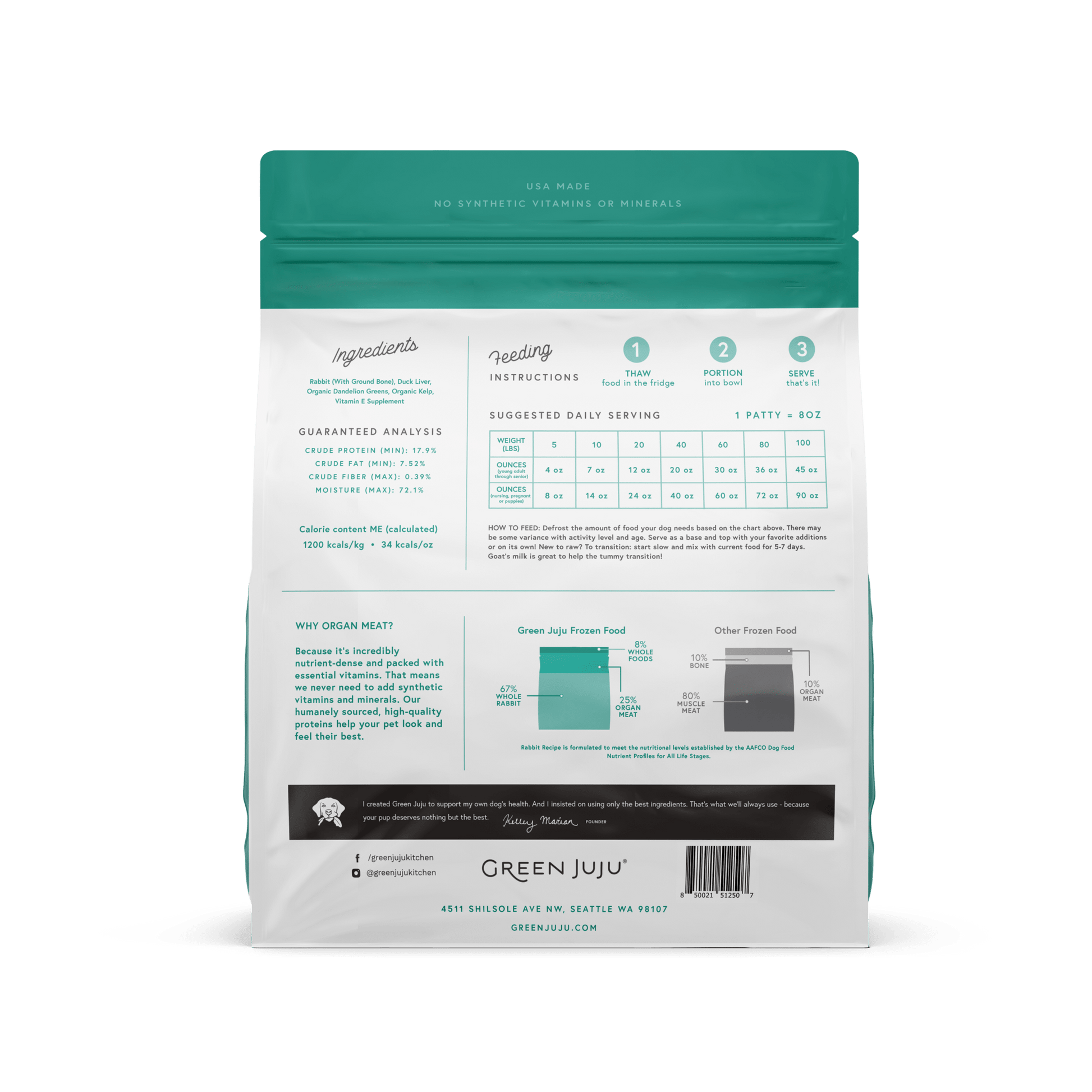 Ingredients: Whole rabbit (with bone), duck liver, organic dandelion greens, organic kelp, vitamin E supplement