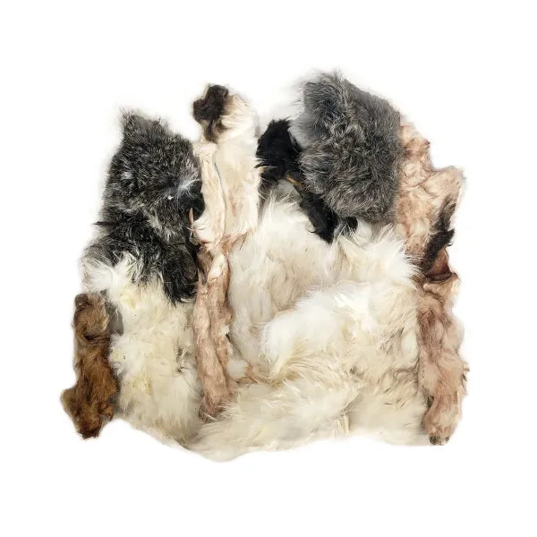 3 oz of assorted dehydrated rabbit hide strips and scalp chips to be fed to cats and dogs as a treat.