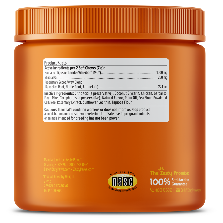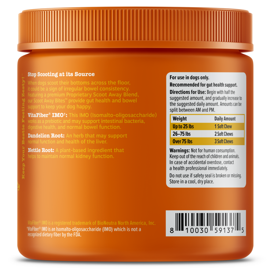- Scooting Much? – Zesty Paws Scoot Away Bites are soft chews that feature VitaFiber * and Dandelion Root to support gut health and bowel function for dogs.
