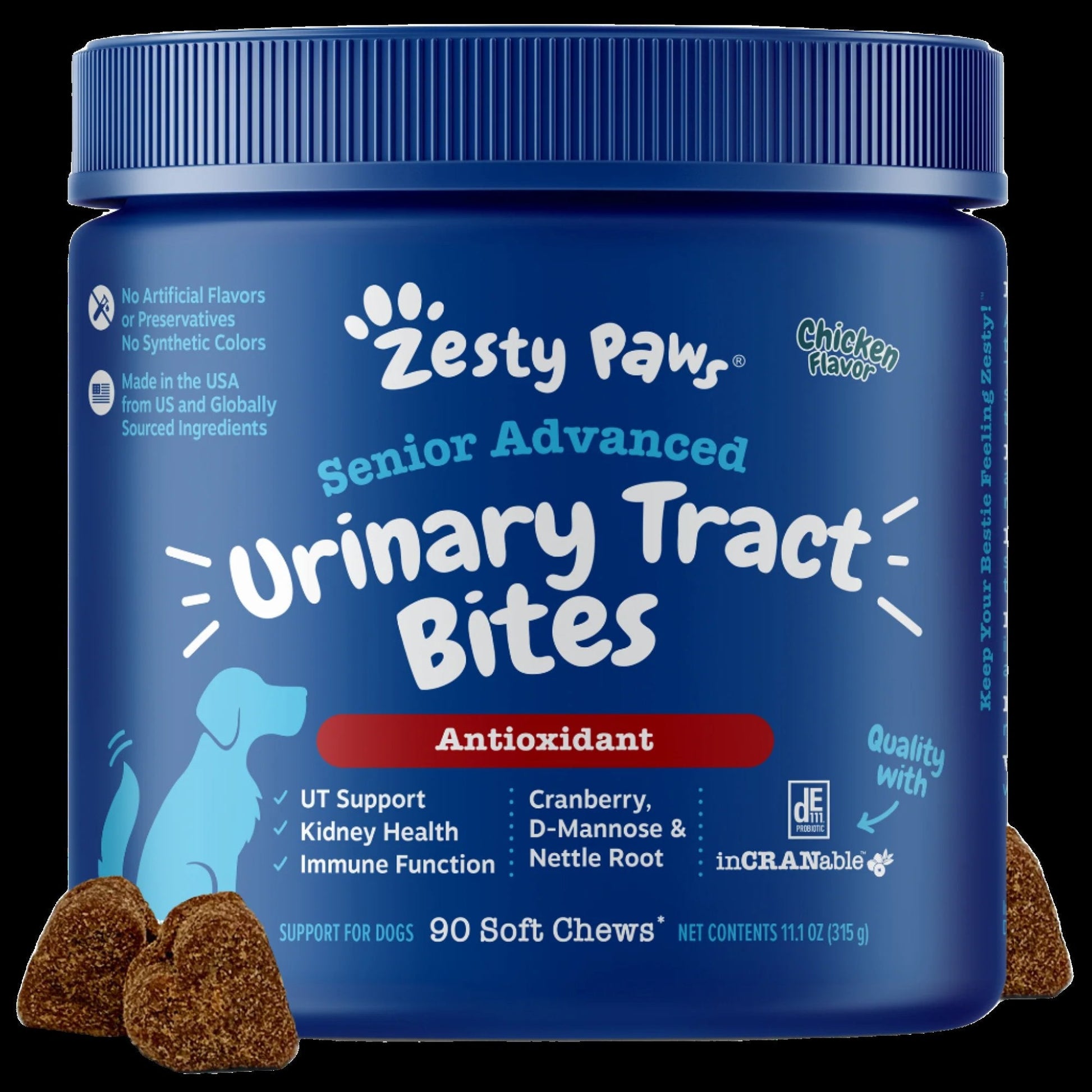 Your longtime bestie is more than just a pet. They're family! So, when it comes to your senior dog's well-being, care, and comfort, you're a natural at keeping your canine companion in control with products that truly benefit your bestie... especially when nature calls! With Zesty Paws Senior Advanced Urinary Tract Bites, your senior dog can enjoy a tasty soft chew that provides kidney, bladder, and UT support for your furry fave.