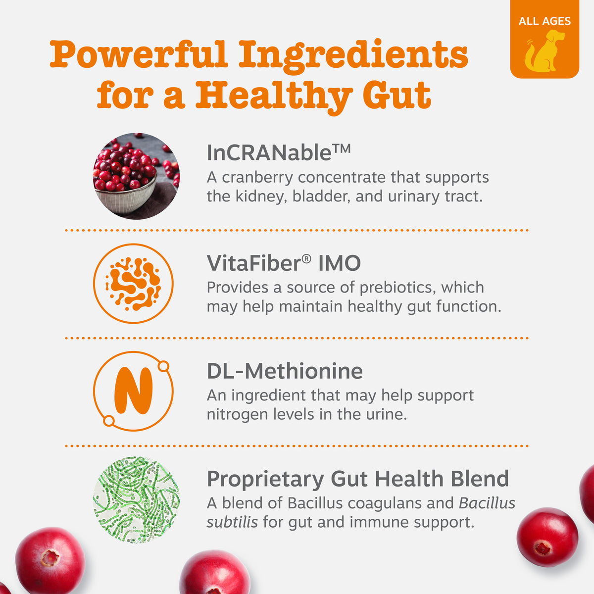- Enhanced With InCRANable – This premium cranberry concentrate helps support the kidney, bladder, and urinary tract for dogs.