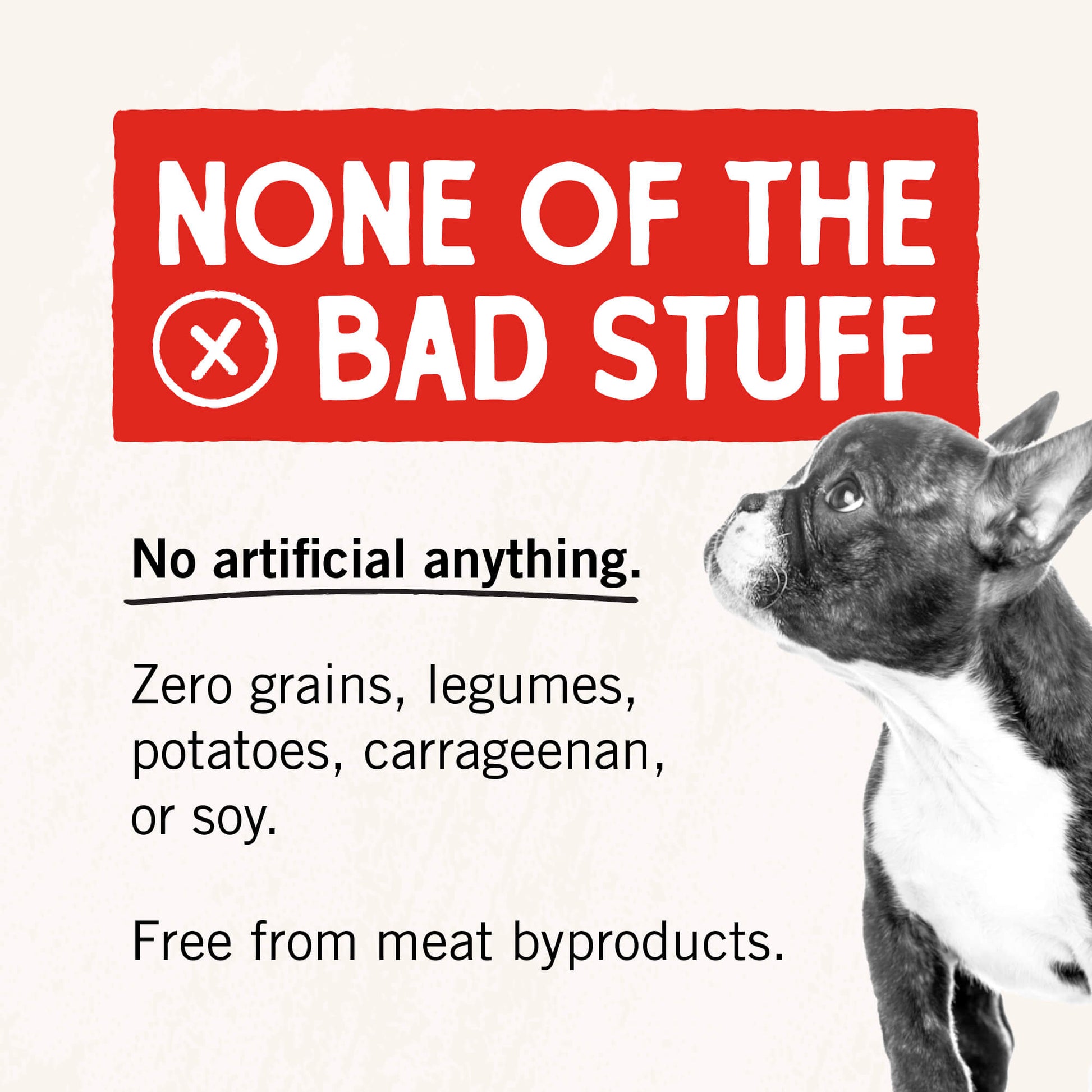 Made without grains, legumes, potatoes, carrageenan, wheat, meat by-products, soy, artificial colors, preservatives or flavors.