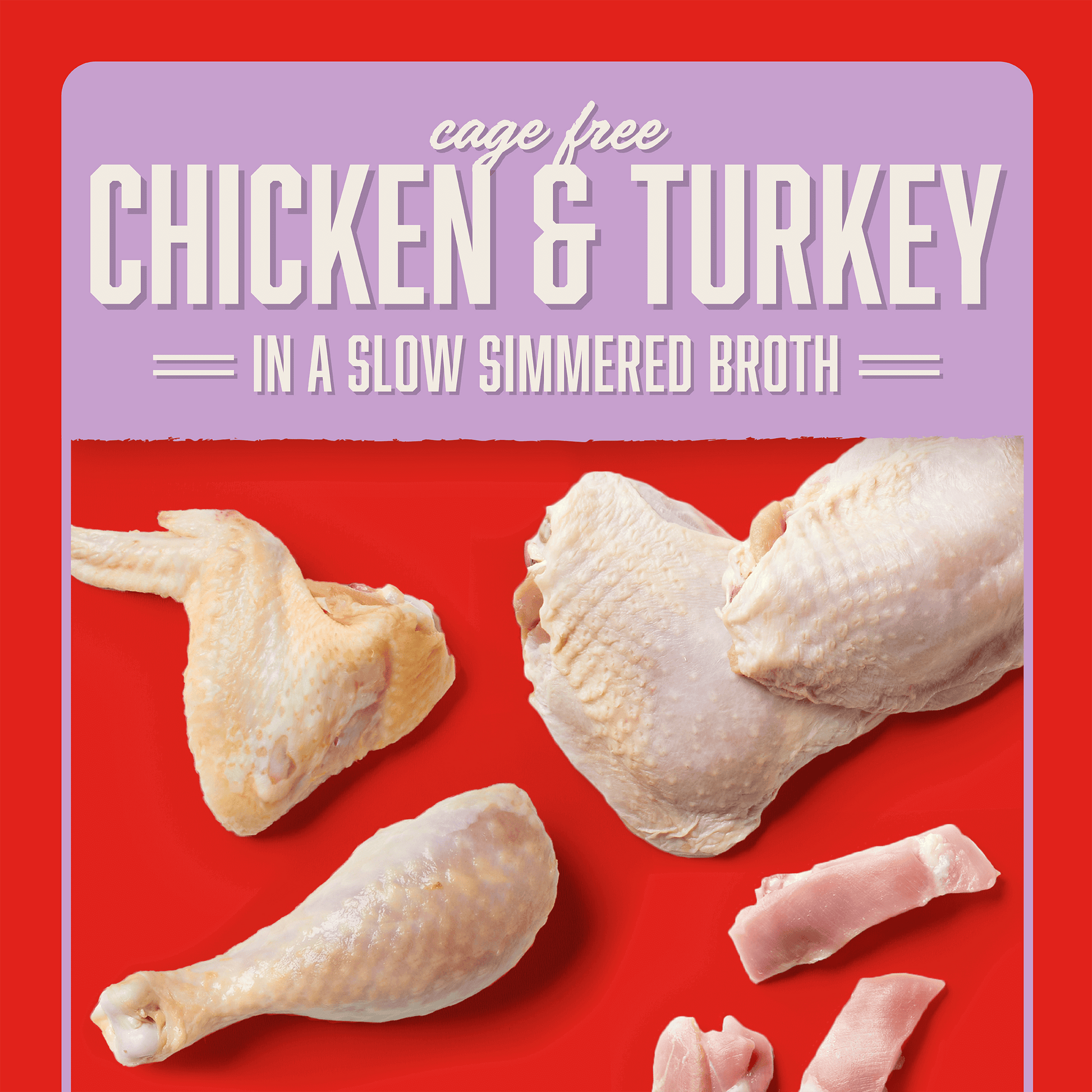 - Real shredded muscle meat and diced meat in a slowly simmered broth