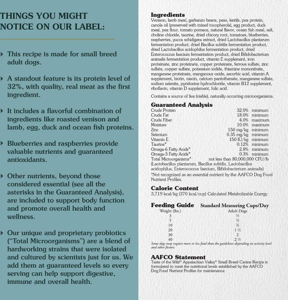 Taste of the Wild Small Breed Appalachian Valley is specifically formulated for small breed canine carnivores. This venison and lamb based recipe with grain-free carbs like sweet potatoes, peas, carrots, and blueberries, provides optimal protein and fats for muscle growth and energy. With venison as the first ingredient and no grains or poultry, this recipe is an excellent digestible alternative for dogs with sensitivities to chicken or grains. Taste of the Wild Small Breed Appalachian is geared for your small breed's unique energy and nutrition needs, while staying away from the nasty excesses like corn, soy or meat by-products.