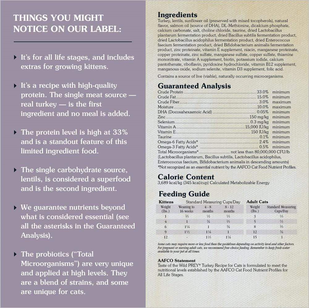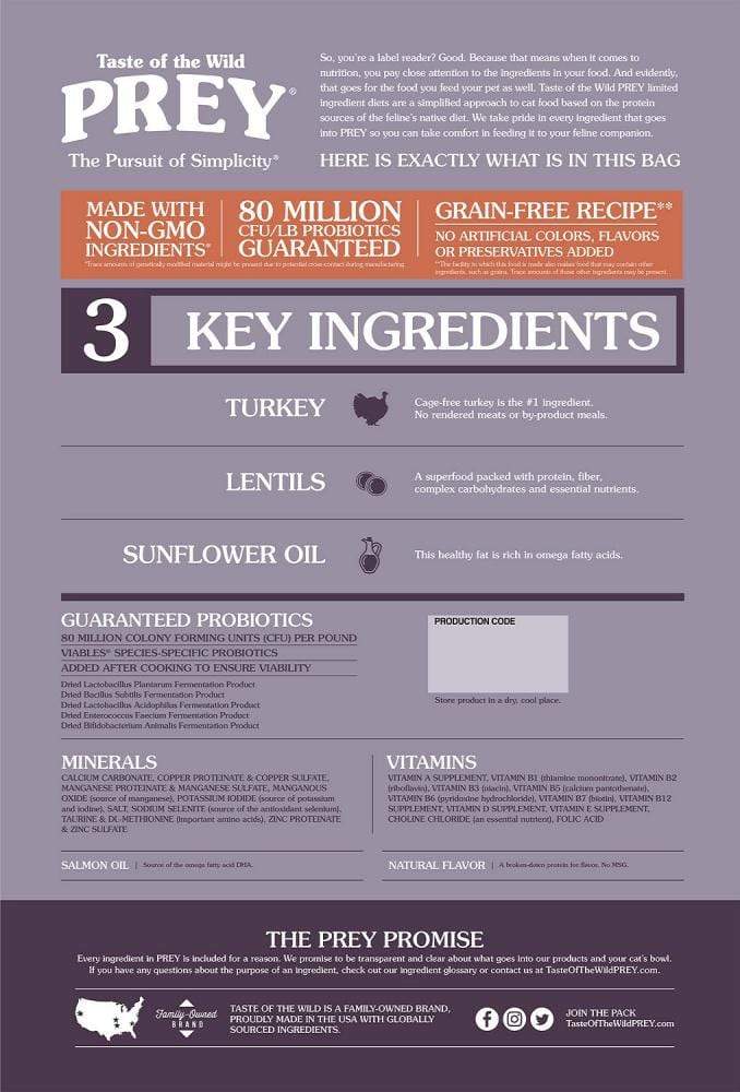 Turkey, lentils, sunflower oil, natural flavor, salmon oil (source of DHA), DL-Methionine, dicalcium phosphate, calcium carbonate, salt, choline chloride, taurine, dried Lactobacillus plantarum fermentation product, dried Bacillus subtilis fermentation product, dried Lactobacillus acidophilus fermentation product, dried Enterococcus faecium fermentation product, dried Bifidobacterium animalis fermentation product, zinc proteinate, vitamin E supplement, niacin, manganese proteinate, copper proteinate, zinc sulfate, manganese sulfate, copper sulfate, thiamine mononitrate, vitamin A supplement, biotin, potassium iodide, calcium pantothenate, riboflavin, pyridoxine hydrochloride, vitamin B12 supplement, manganous oxide, sodium selenite, vitamin D supplement, folic acid.Guaranteed Analysis