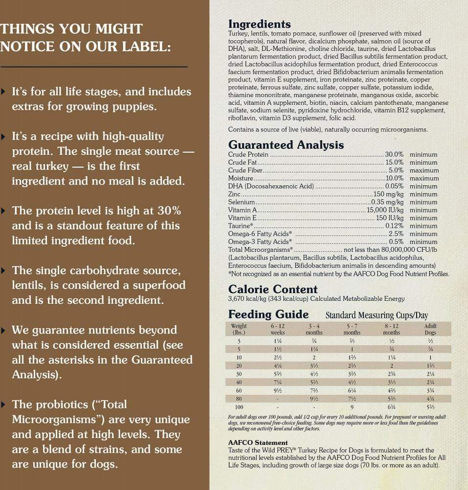 Turkey, lentils, tomato pomace, sunflower oil, natural flavor, dicalcium phosphate, salmon oil (source of DHA), salt, DL-Methionine, choline chloride, taurine, dried Lactobacillus plantarum fermentation product, dried Bacillus subtilis fermentation product, dried Lactobacillus acidophilus fermentation product, dried Enterococcus faecium fermentation product, dried Bifidobacterium animalis fermentation product, vitamin E supplement, iron proteinate, zinc proteinate, copper proteinate, ferrous sulfate, zinc sulfate, copper sulfate, potassium iodide, thiamine mononitrate, manganese proteinate, manganous oxide, ascorbic acid, vitamin A supplement, biotin, niacin, calcium pantothenate, manganese sulfate, sodium selenite, pyridoxine hydrochloride, vitamin B12 supplement, riboflavin, vitamin D3 supplement, folic acid.Guaranteed Analysis