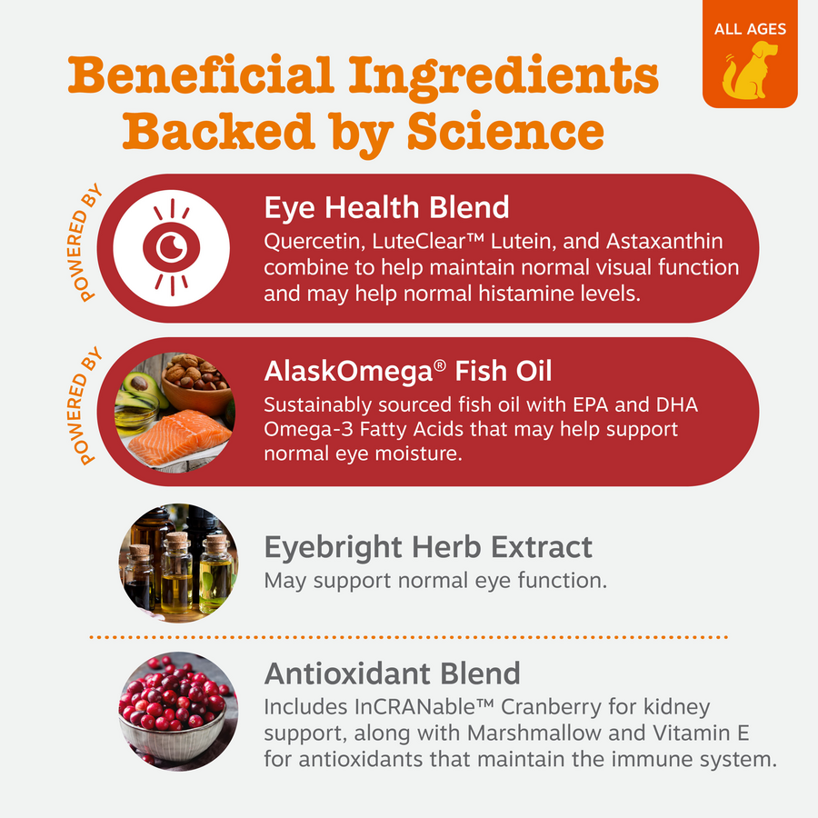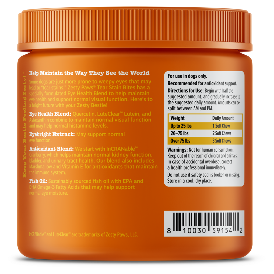 Some dogs are prone to weepy eyes that may lead to tear stains. But wipes, pads, wash, and drops aren't the only ways you can help with tear stains! Our Tear Stain Bites support normal eye moisture for canine pets thanks to AlaskOmega® fish oil in every chew. Plus, these chewables also feature an antioxidant blend that features advanced Cran-Max®, along with Quercetin, Lutein, and Astaxanthin to maintain normal visual function and may help normal histamine levels.