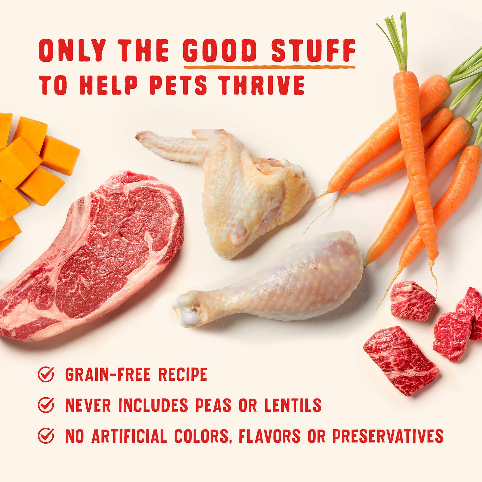 - No grains, peas, lentils, artificial colors, flavors or preservatives added