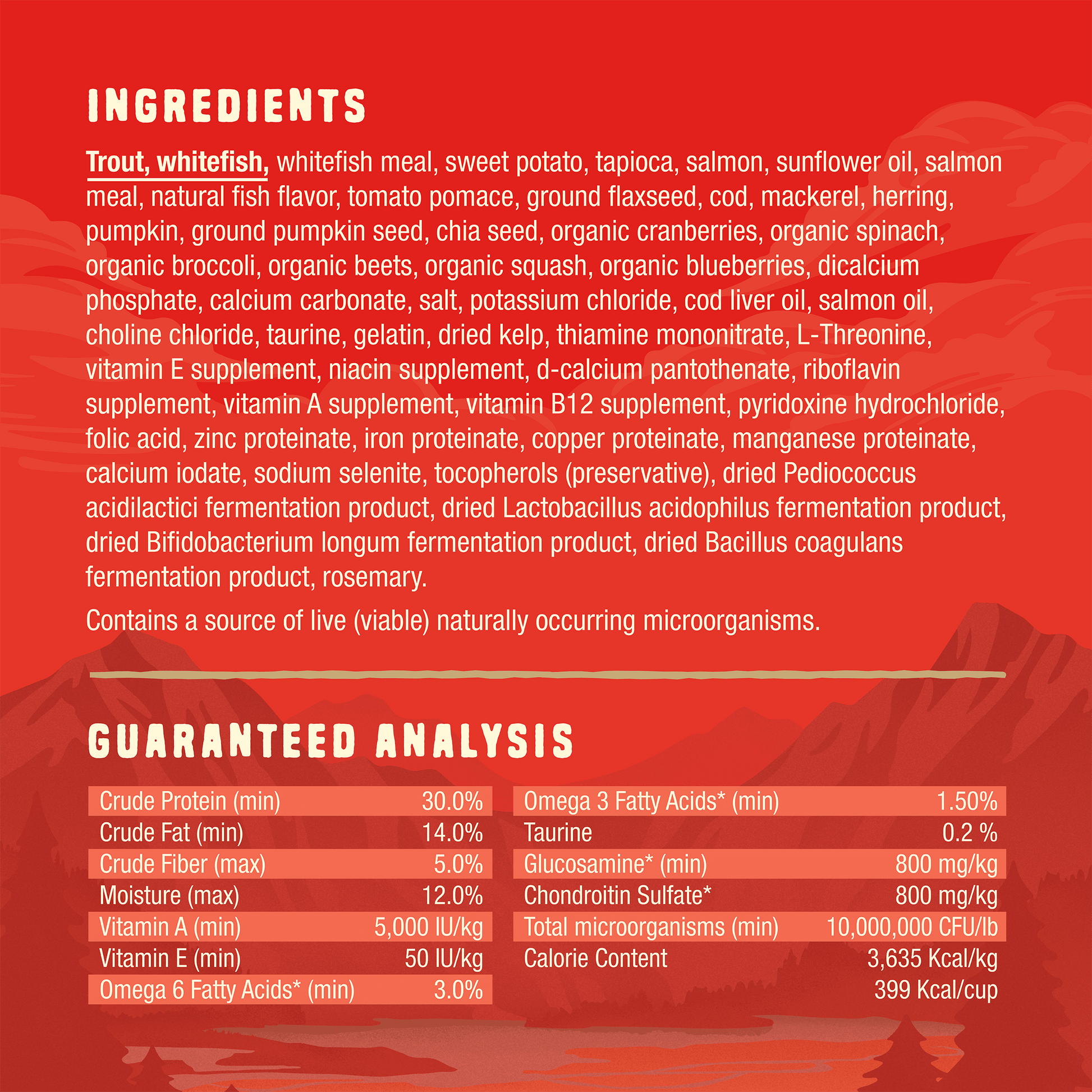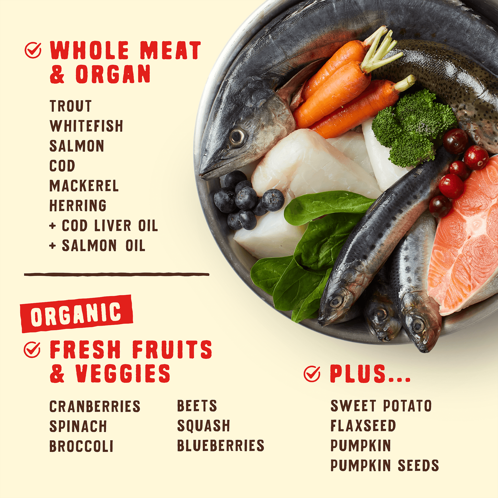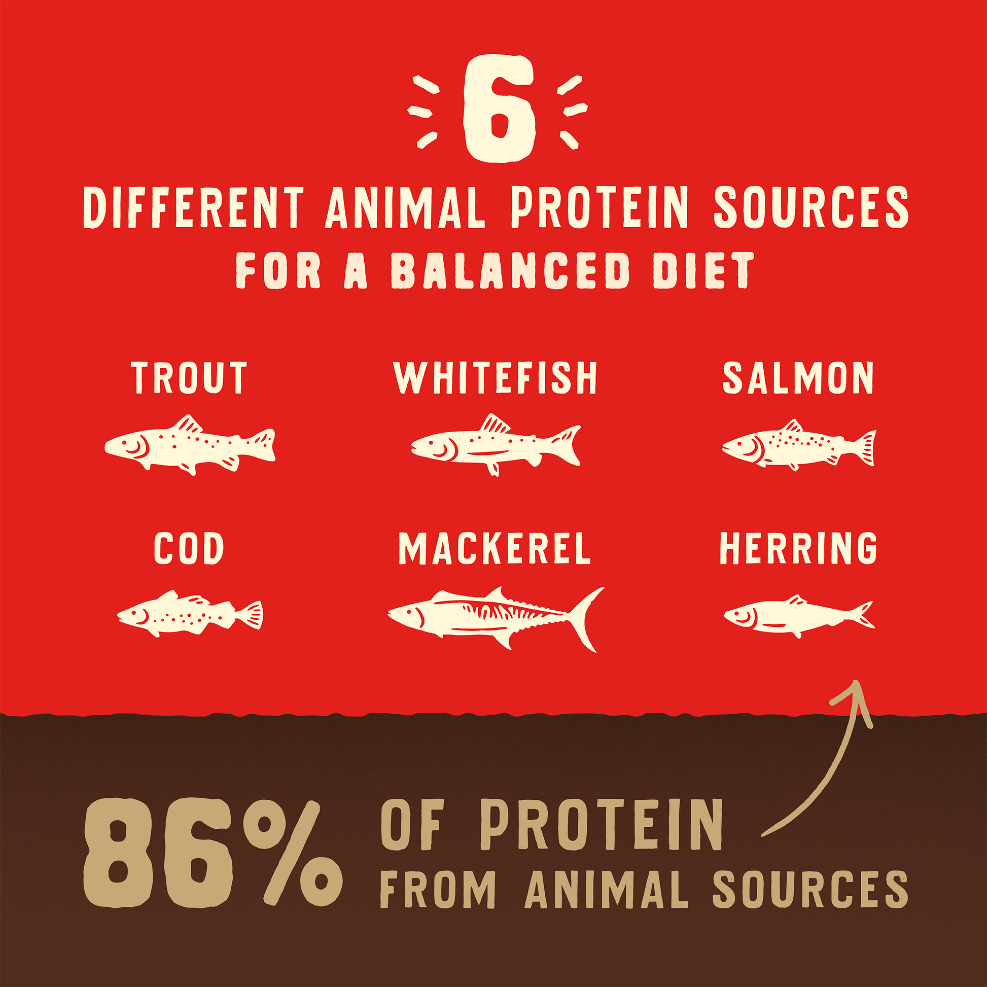 - Packed with meat from six poultry-free animal proteins - trout, whitefish, salmon, cod, mackerel and herring