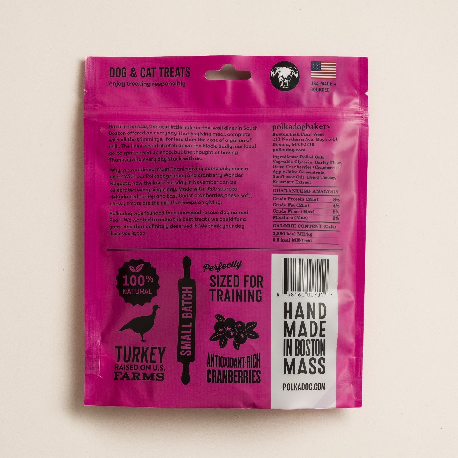 Made with USA-sourced dehydrated turkey and East Coast cranberries, these soft, chewy all-natural dog treats are the gift that keeps on giving. Made in our Boston Fish Pier kitchen, these healthy handmade treats are loved by dogs everywhere.